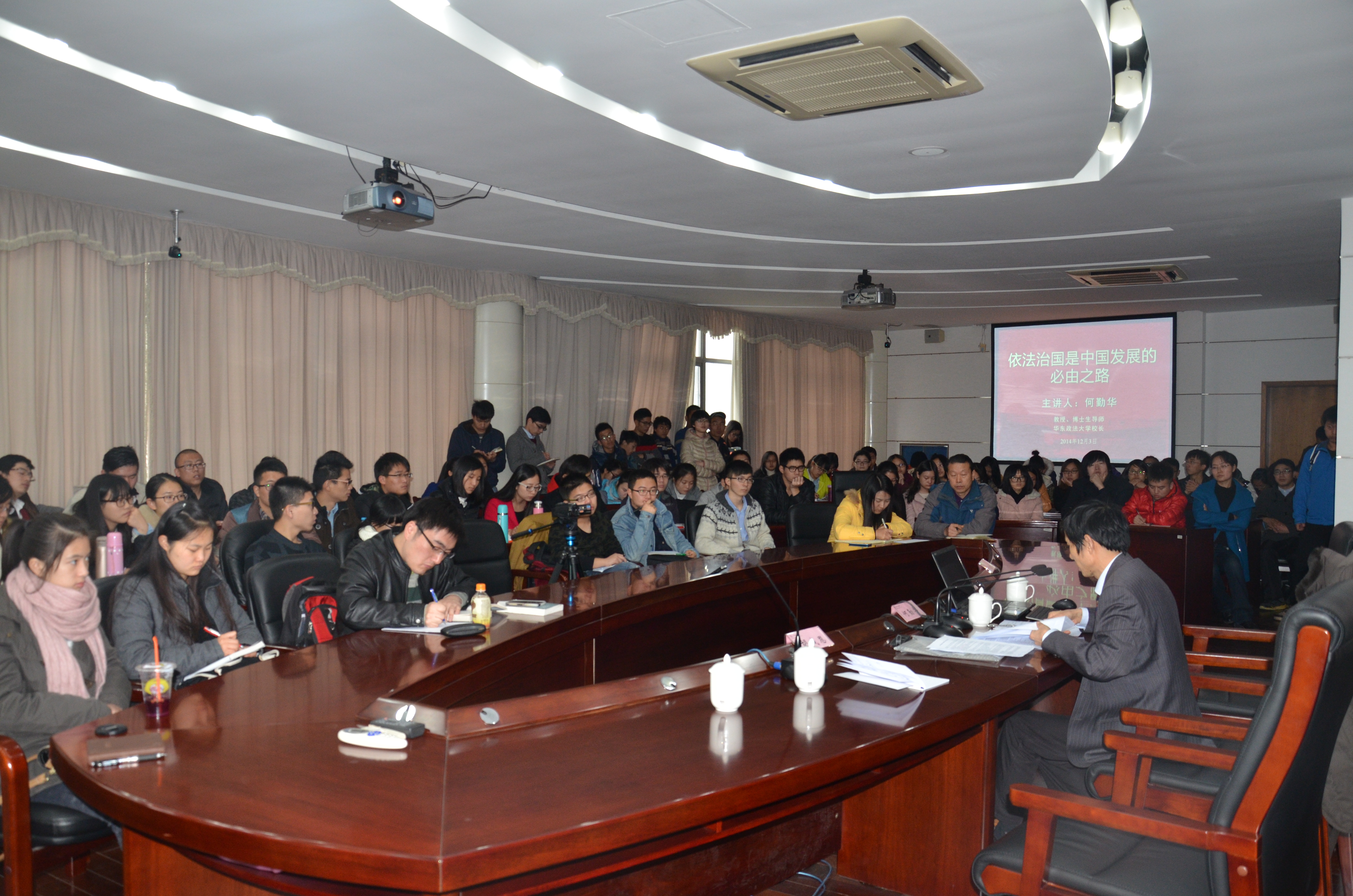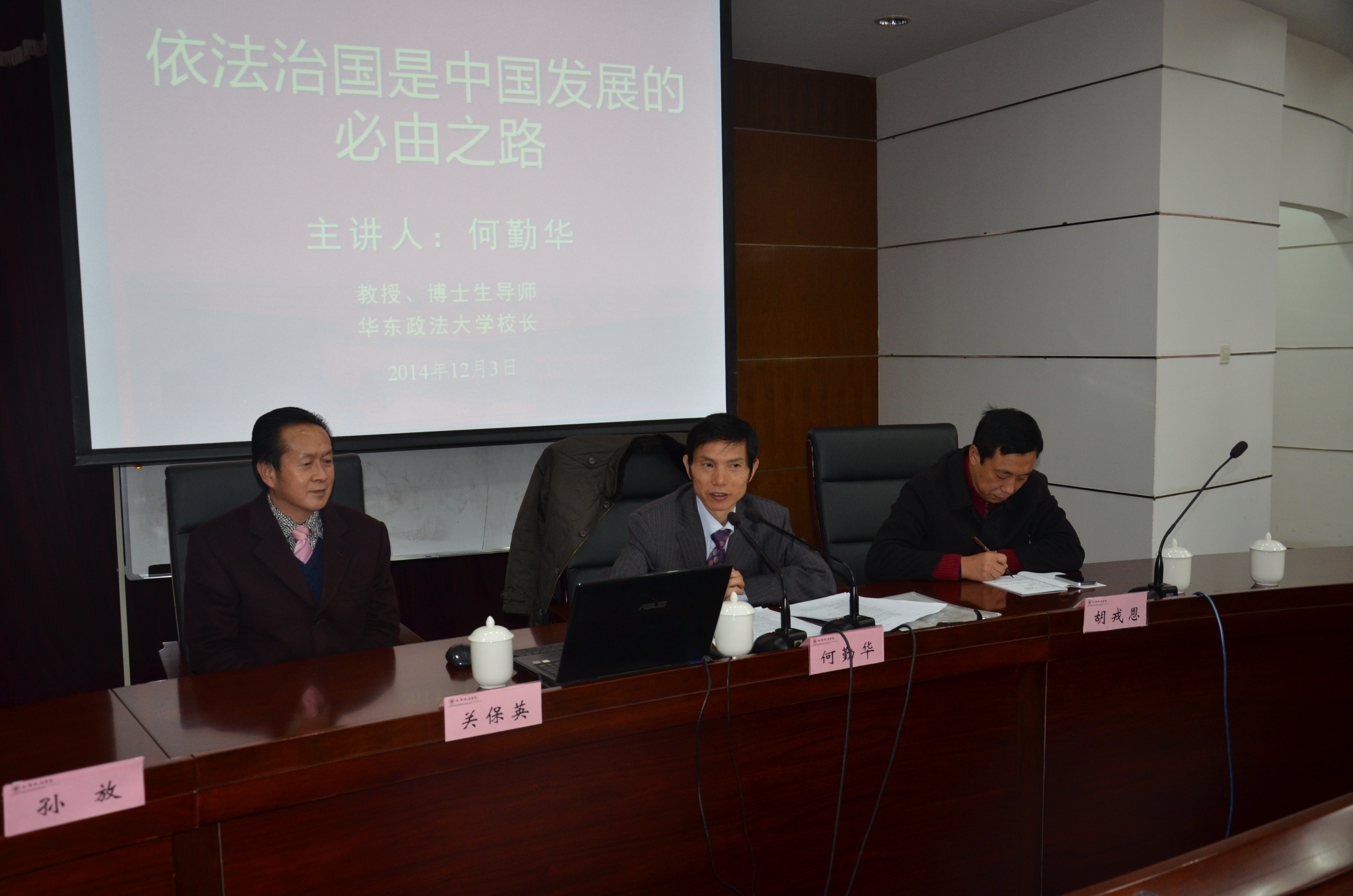 12月3日下午,华东政法大学校长、博士生导师何勤华教授应邀为我校师生作题为《依法治国是中国发展的必由之路》的学术讲座。本次讲座属于我校应用社会科学研究院主办的“法学名家系列讲座”之一。讲座由我校副校长、博士生导师关保英教授主持。学校部分教师、硕士研究生及本科生参加了本次讲座。