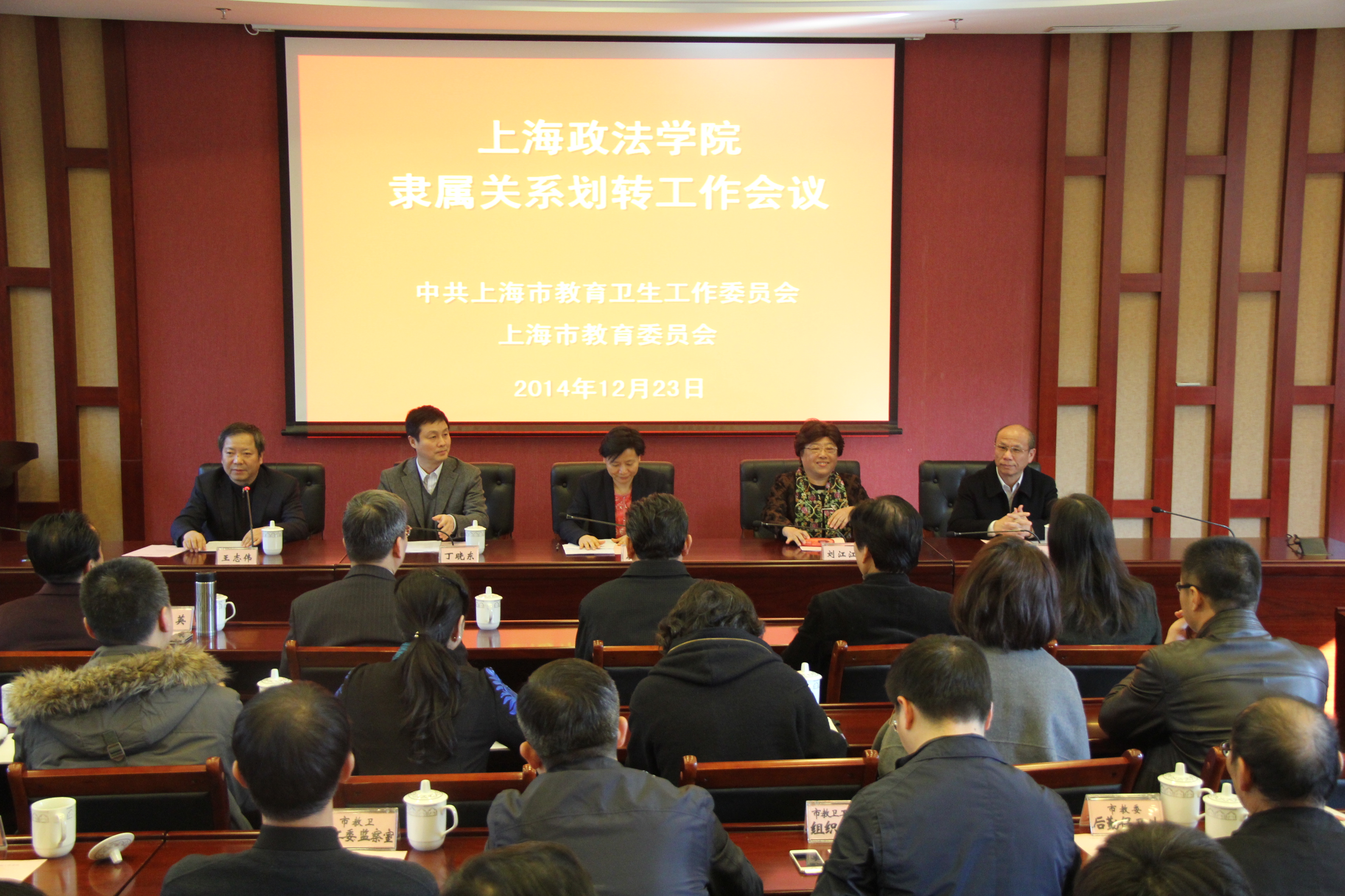 12月23日下午,上海政法学院隶属关系划转工作会议顺利召开。市教卫工作党委副书记虞丽娟同志、市教委副主任丁晓东同志、市司法局党委副书记刘江江同志、市司法局副局长朱久伟同志出席会议。市发展改革委、市财政局、市编办、市司法局相关部门负责同志,市教卫工作党委、市教委相关处室负责同志,我校党政领导班子成员、全体中层干部参加会议。会议由市教委秘书长王志伟同志主持。