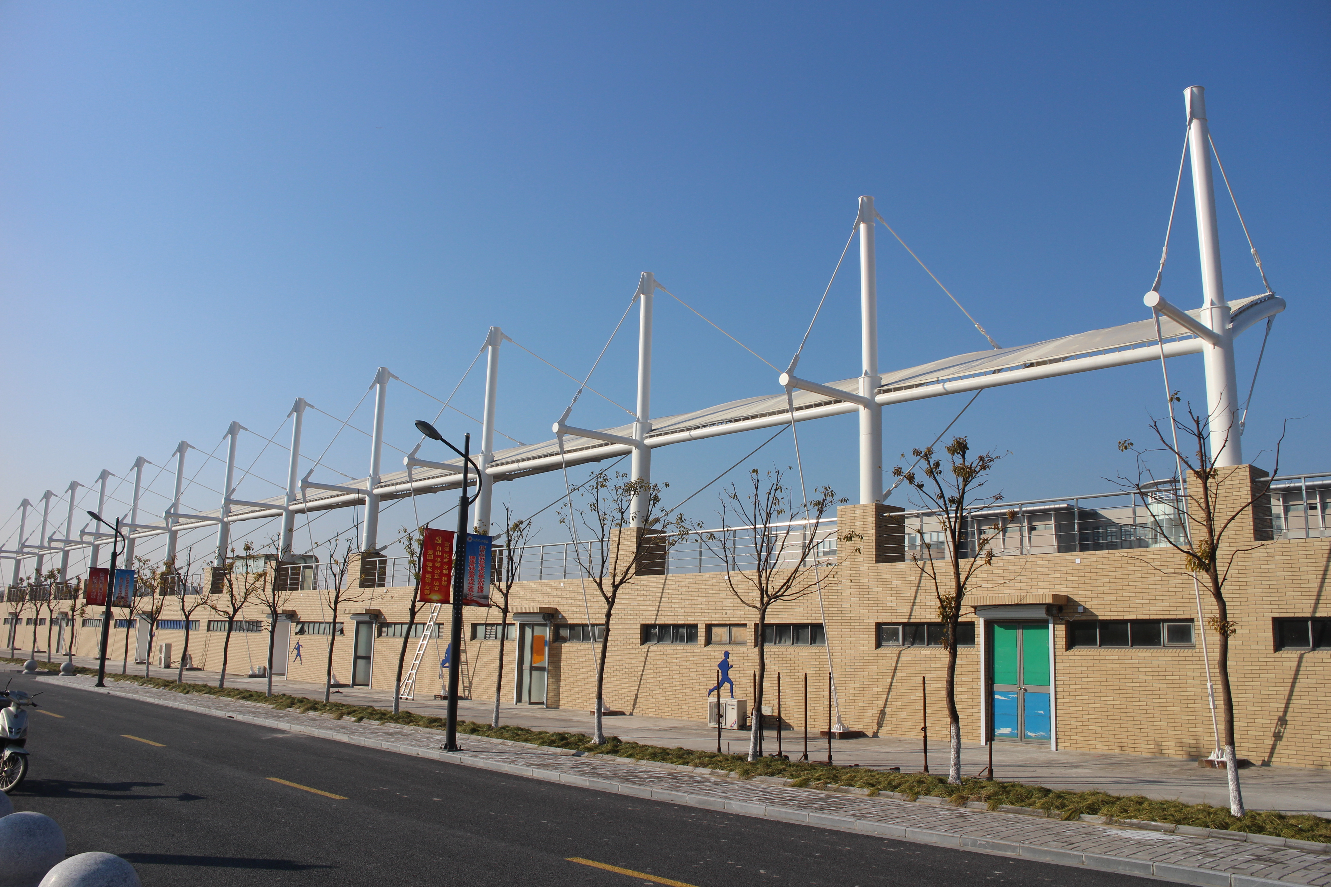 体育场看台改造项目与新建的学生礼堂、训练馆、比赛馆外部环境布置相互协调配套。该项目由基建办拟制改造方案,设备处委托招标代理公司进行公开招标,由上海星宇建设集团有限公司中标施工。该项目主要包括看台外墙面改造、新做体育运动浮雕、看台护栏改造、钢架油漆和翻新等内容。工程于2015年1月5日开工,施工单位严密组织施工,落实质量、进度、安全管理措施;后勤保障中心周密计划、全过程跟踪管理;监理单位严格要求,认真落实检查验收制度;为项目施工按时保质保量安全有序完成打下了良好的基础。