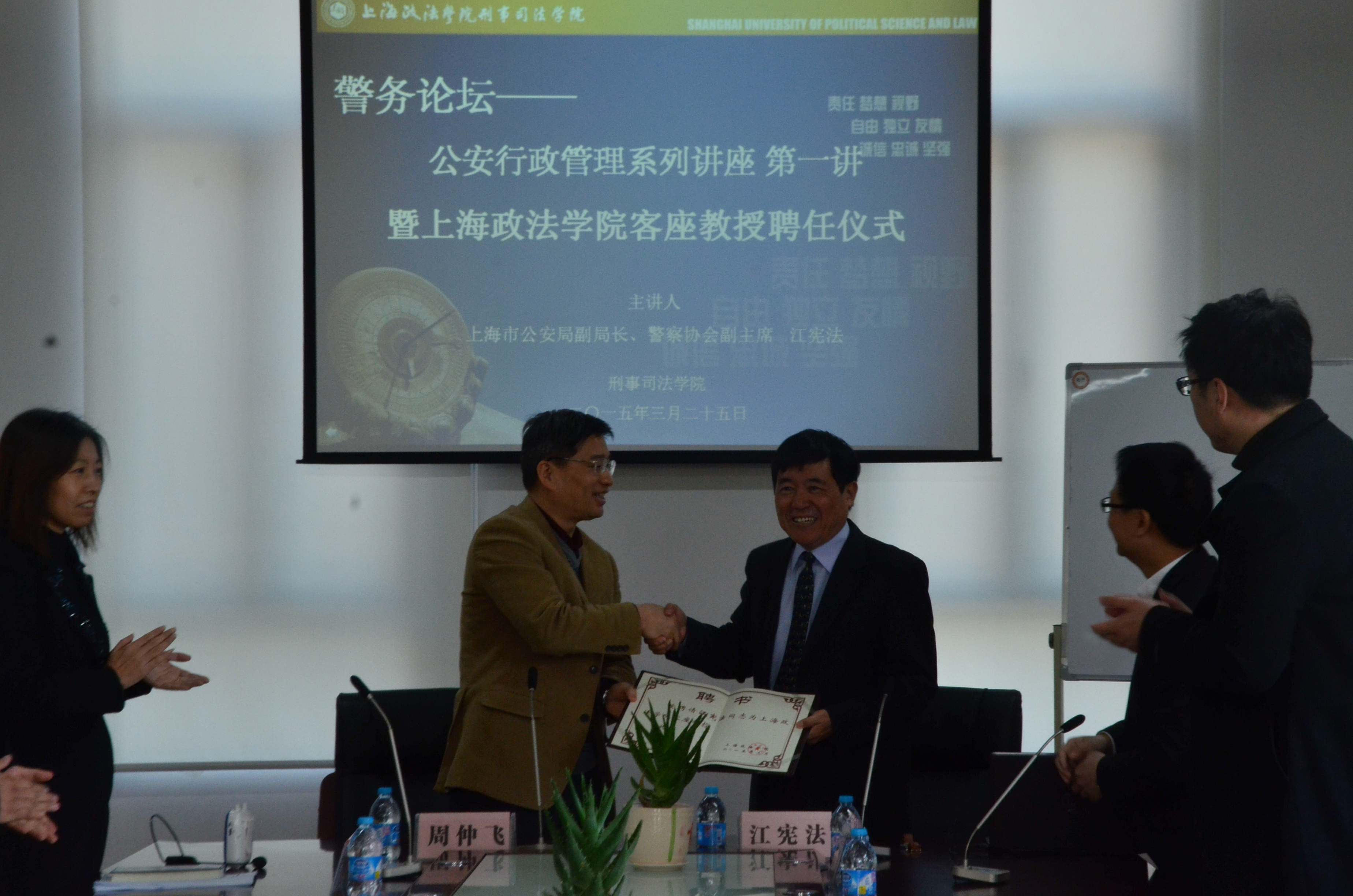 受聘仪式上,周仲飞校长为江宪法同志颁发了上海政法学院客座教授聘书。随后,江宪法教授与师生共同共话公安行政管理工作中的故事,分享了自己的职业经历与心得体悟,并从中央批准公安改革方案和“1231”外滩事件两个角度分析了公安行政管理的弊端和尚需改善之处。江宪法同志认为,公安体系的改革受到检法二家改革和中国法制建设的影响,而改革的关键就在于公安管理中事权关系,正确手段就是简政放权。最后,江宪法同志分析了“1231”事件对于公安行政管理的重大影响,告诫众人公安管理中预警机制的重要性。