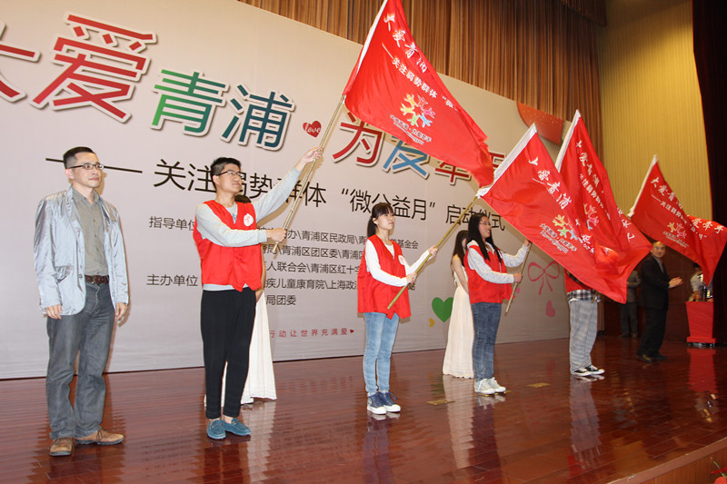 随后,彭辉副部长、徐锐副部长为义工志愿者授旗,义工志愿者代表进行宣誓。与会领导上台共同启动了“微公益月”。最后,与会义工志愿者代表齐唱公益歌曲《爱因为在心中》,启动仪式圆满落幕。(张宏辉 撰稿)