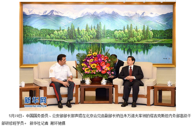据中央电视1套晚间新闻报道,5月19日,国务委员、公安部部长郭声琨今天会见了由副部长纳伍朱万诺夫率领的塔吉克斯坦内务部高级干部研修班学员。