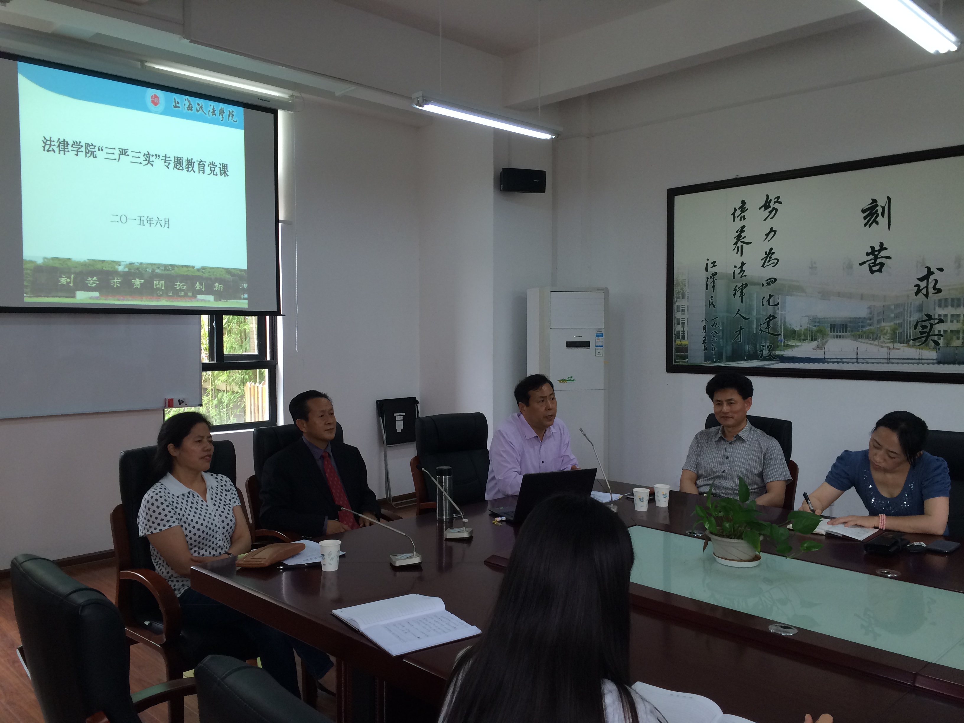 2015年6月9日,法律学院举办“三严三实”专题教育党课。我校副校长关保英教授,我校纪委副书记、监察室主任邓骏,法律学院院长侯怀霞教授,法律学院党总支书记文立月,法律学院学生工作负责人闯晓燕以及法律学院全体教师参加了此次会议。