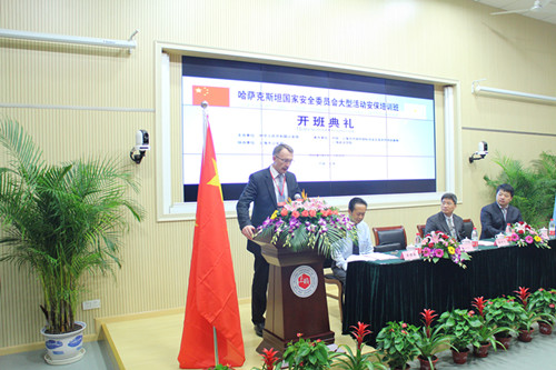 周仲飞校长在致辞中对哈萨克斯坦国家安全委员会大型活动安保培训班成员的到来表示了热烈欢迎,并简要阐述了培训基地的建设历程和发展现状,同时对我校筹备此次培训班的具体工作进行了介绍。他表示,此次培训班的顺利开班,必将加深中哈两国人民的友谊,培训基地的发展也将再上台阶。(钱平广 撰稿 /周玉诚 摄影)