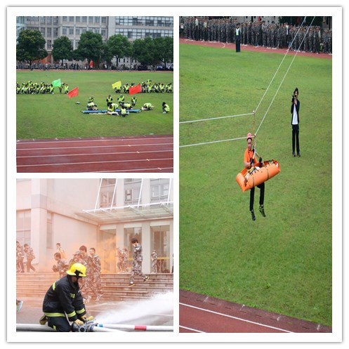 首先,军训团副团长、保卫处处长郭玉生主持消防疏散及减防灾救援演习。这是我校第8年在军训中进行消防疏散逃生演习,而减防灾训练是我校今年军训首次增加的内容。警报拉响,主教学楼烟雾四起,学生从教学楼紧急向体育场指定地点疏散集结,佘山消防中队消防队员进行灭火救助。同时,操场中间设有红、黄、绿三个不同等级的救援区,大批“伤员”从教学楼内运往操场,经过15天训练选拔出来的优秀学院组成的救援小组采用担架搬运、背后拖拉、被单拖拉、肢端拖拉等科学搬运方法对伤员进行全方位的保护。专业救援队员在教学楼和主席台之间采用横渡、速降的方式救援濒危伤员,然后进行紧急心肺复苏和人工呼吸、伤员的胸外按压等急救方法急救,最后送往救护车安全运走。救援队还展示了各种伤口包扎等急救措施。整个过程迅速有序,各排同学按照逃生演练的规定路线,在确保安全的情况下,以最短的时间逃离了教学楼,高质量地完成了疏散逃生任务。