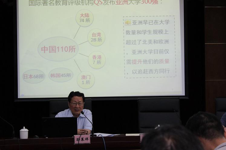 为有计划、有目的、高效率、高质量地开展我校本科专业自评工作,科学制定专业评估指标体系,完善教学质量保障体系建设,2015年7月6日,我校在行政楼五楼视频会议室召开了“2015年本科专业评估工作研讨会”。会议邀请中国高等教育评估协会副会长、上海市教育评估院首席专家孙莱祥教授作专题报告,副校长关保英教授、各二级学院院长、副院长、教研室主任及相关职能部门负责人40余人参加会议。会议由教学质量督查与评估办公室副主任奚小玮主持。