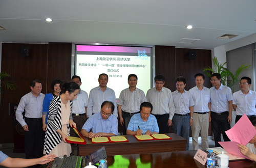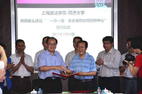 7月15日,我校与同济大学正式签署共同牵头建设“‘一带一路’安全保障协同创新中心”(下称“协创中心”)的协议。我校校长周仲飞、副校长关保英、国际交流处处长王蔚、教务处处长陈剑峰、科研处处长张远新、国际事务与公共管理学院院长汪伟民、发规处处长石其宝、国际交流处钱平广等,参加了签约仪式。