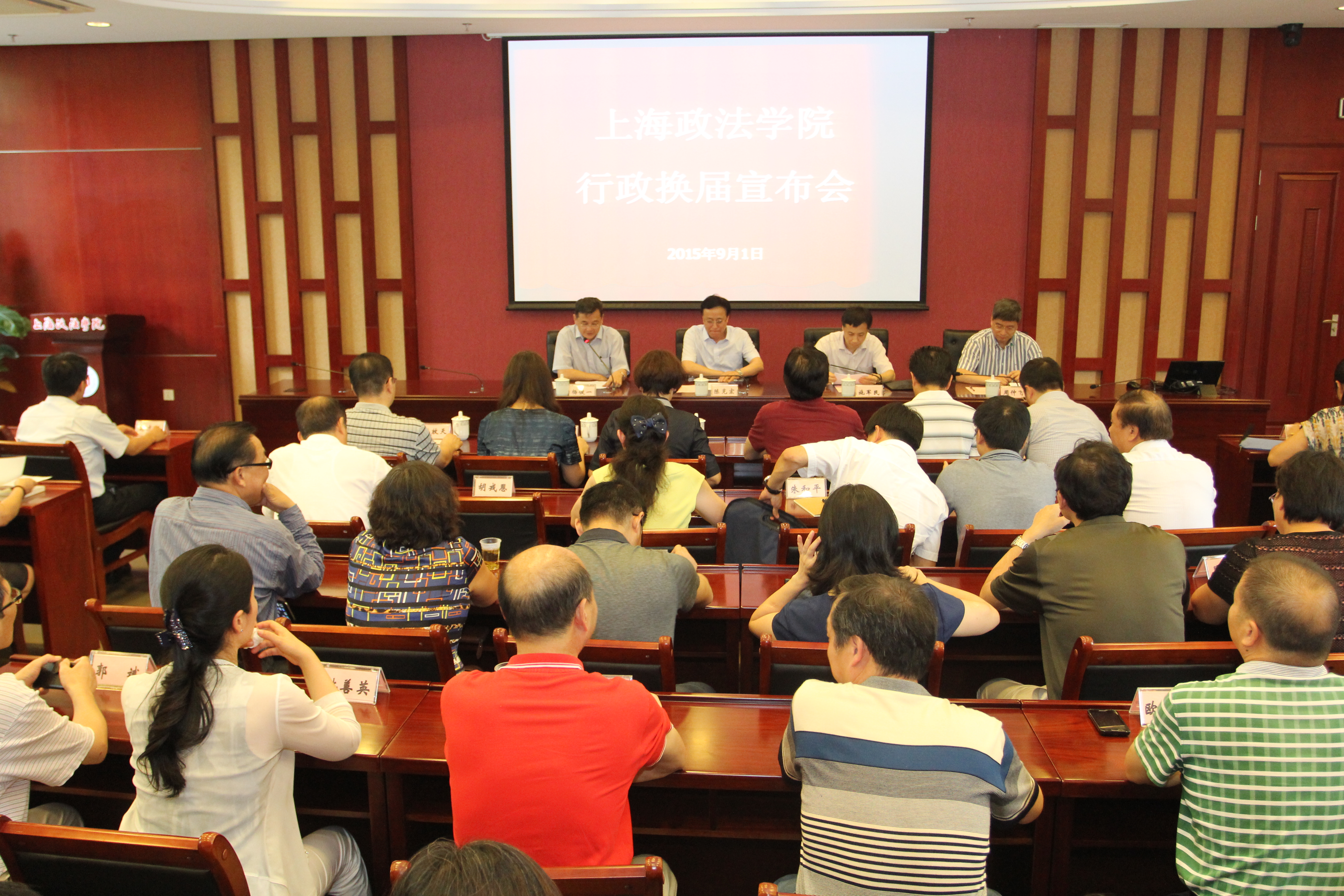 2015年9月1日下午,上海政法学院行政领导班子换届宣布会在校部楼107会议室举行,会议由校党委书记杨俊一同志主持,市教卫工作党委书记陈克宏同志出席会议并作重要讲话。学校全体中层以上干部参加了会议。