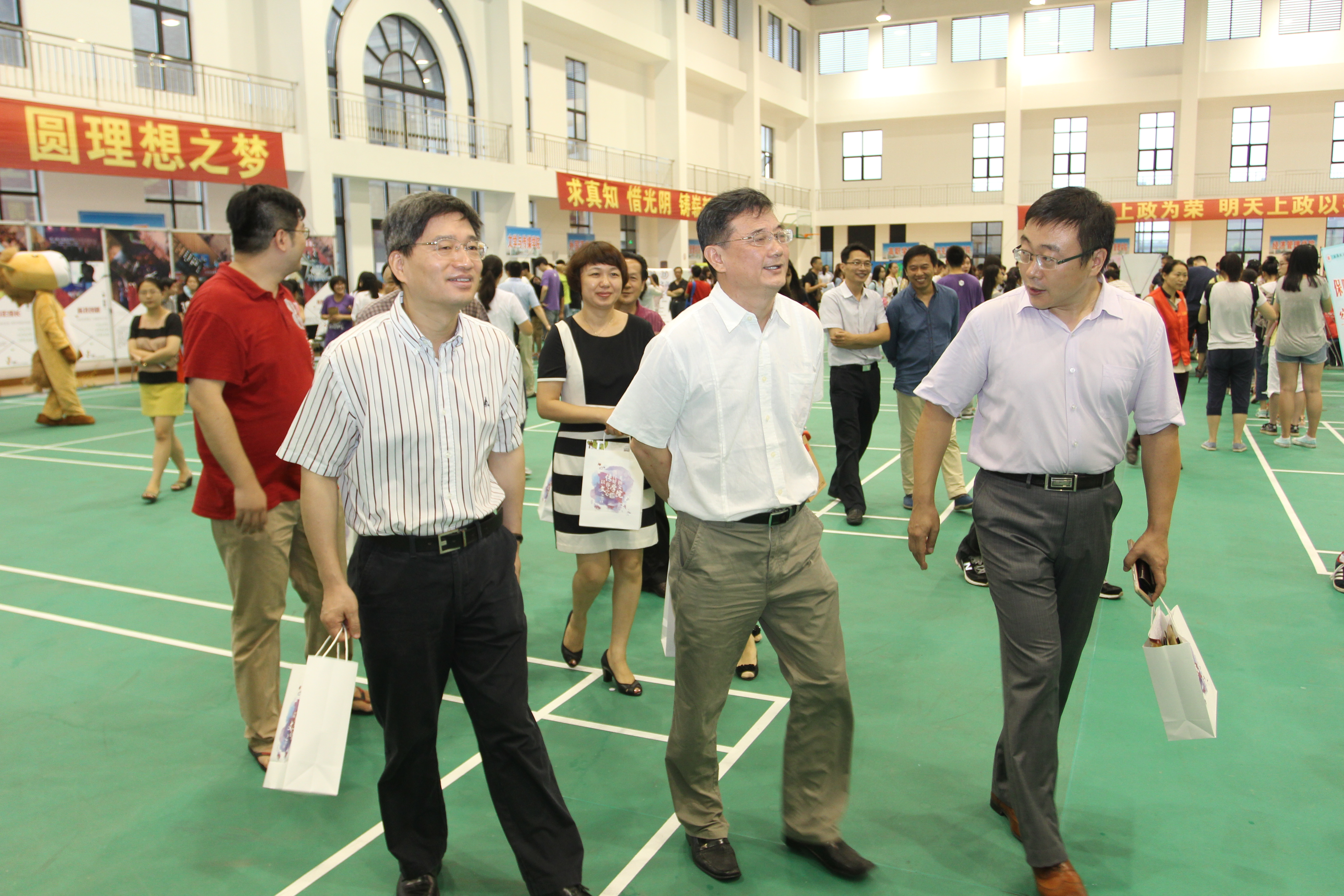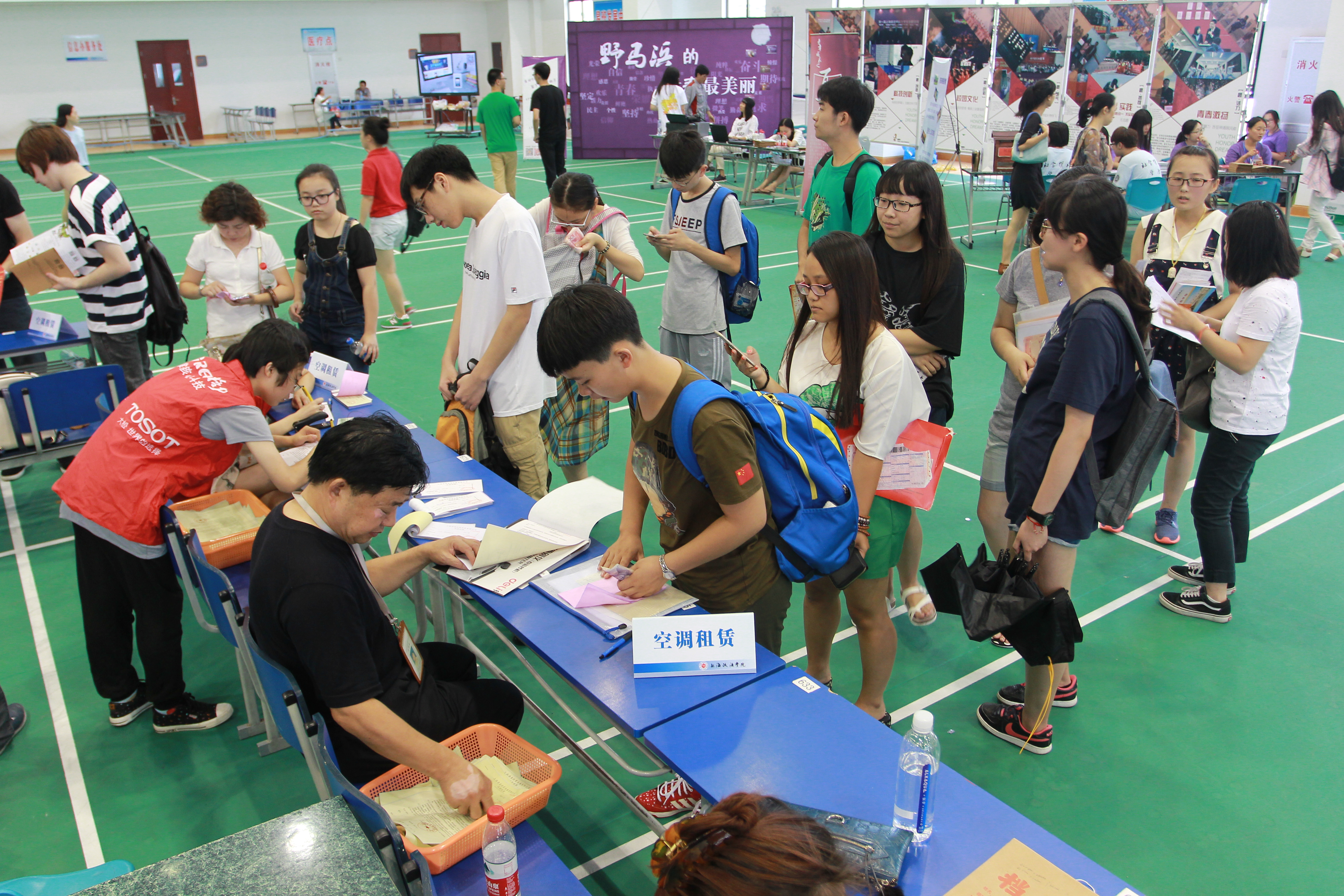 学校办公室、宣传部、学生工作部、后勤保障处、保卫处、计财处、教务处、招生与就业指导办公室、基建办、信息办、团委、心理咨询中心等部门都派人来到训练馆,为新生排忧解难。训练馆门口用巨大的气球做了拱门,上书“欢迎新同学”,路旁是新生报到流程的说明展板,还有很多高年级的学生志愿者,为新生和家长提供帮助。训练馆内早早地拉起了横幅和标语,鼓励学生渴求真理、珍惜光阴,再谱人生新篇章。