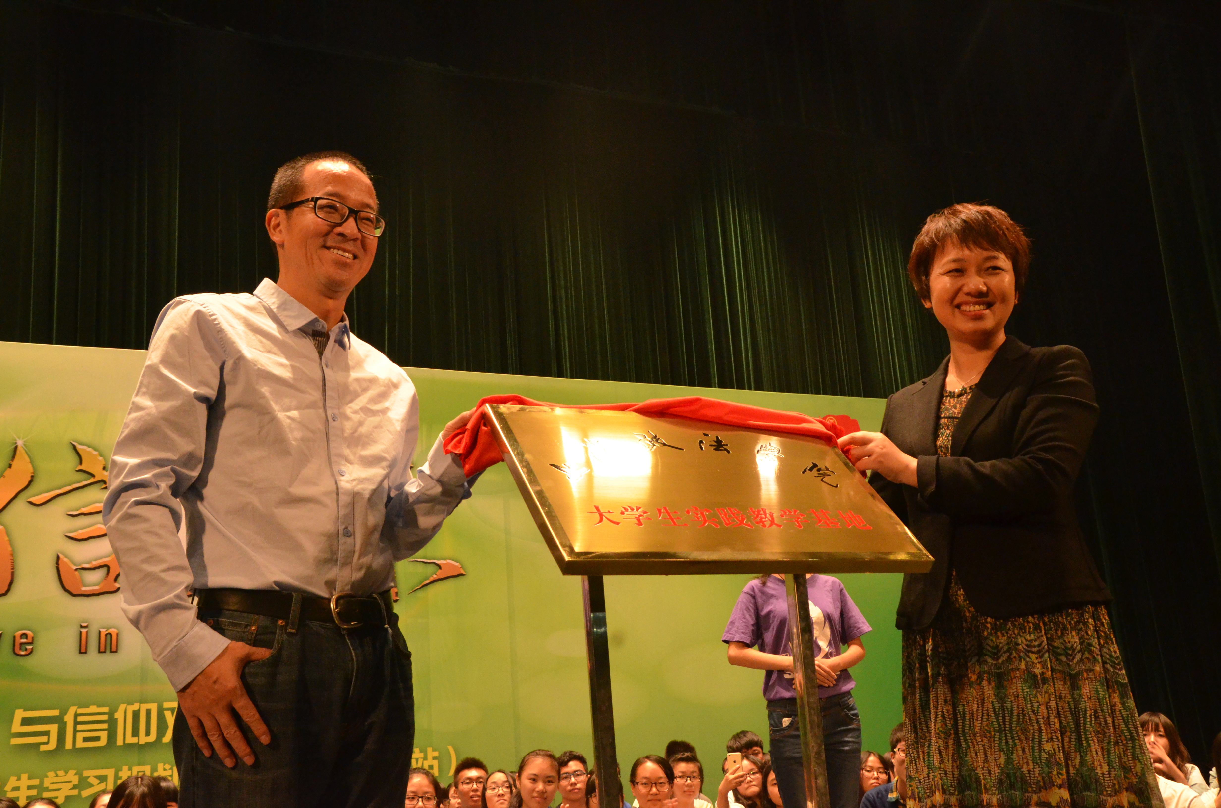 揭牌仪式后,在学生礼堂,新东方教育集团创始人兼CEO俞敏洪,新东方(上海)英语学习部总监、上海外语频道ICS节目节目主持人邱政政,新东方集团高级培训师、演讲师、2005年国际英语演讲比赛世界冠军夏鹏共同为我校大学生带来了“相信未来”全国大学生学习规划公益巡讲(上海站)主题演讲。讲座由团委书记陆嵬主持。我校1300多名大学生聆听演讲。俞敏洪老师细细回味着自己刚刚迈入大学时的各种窘迫与挣扎,回顾自己战胜自卑的心路历程,通过毫不掩饰的自我展示为同学们提炼成长的经验。他告诉同学们如何接受自己、突破自己和发展自己。邱政政老师围绕大学生英语学习与大学生们分享了心得和感悟。夏鹏老师结合自己实例,告诫大学生要在大学期间找到自身爱好和特长,努力做到极致,就能成功。一个半小时的讲座中,老师们幽默风趣的语言风格、深入浅出的讲解方式和缜密犀利的逻辑分析博得了在场师生热烈的掌声。