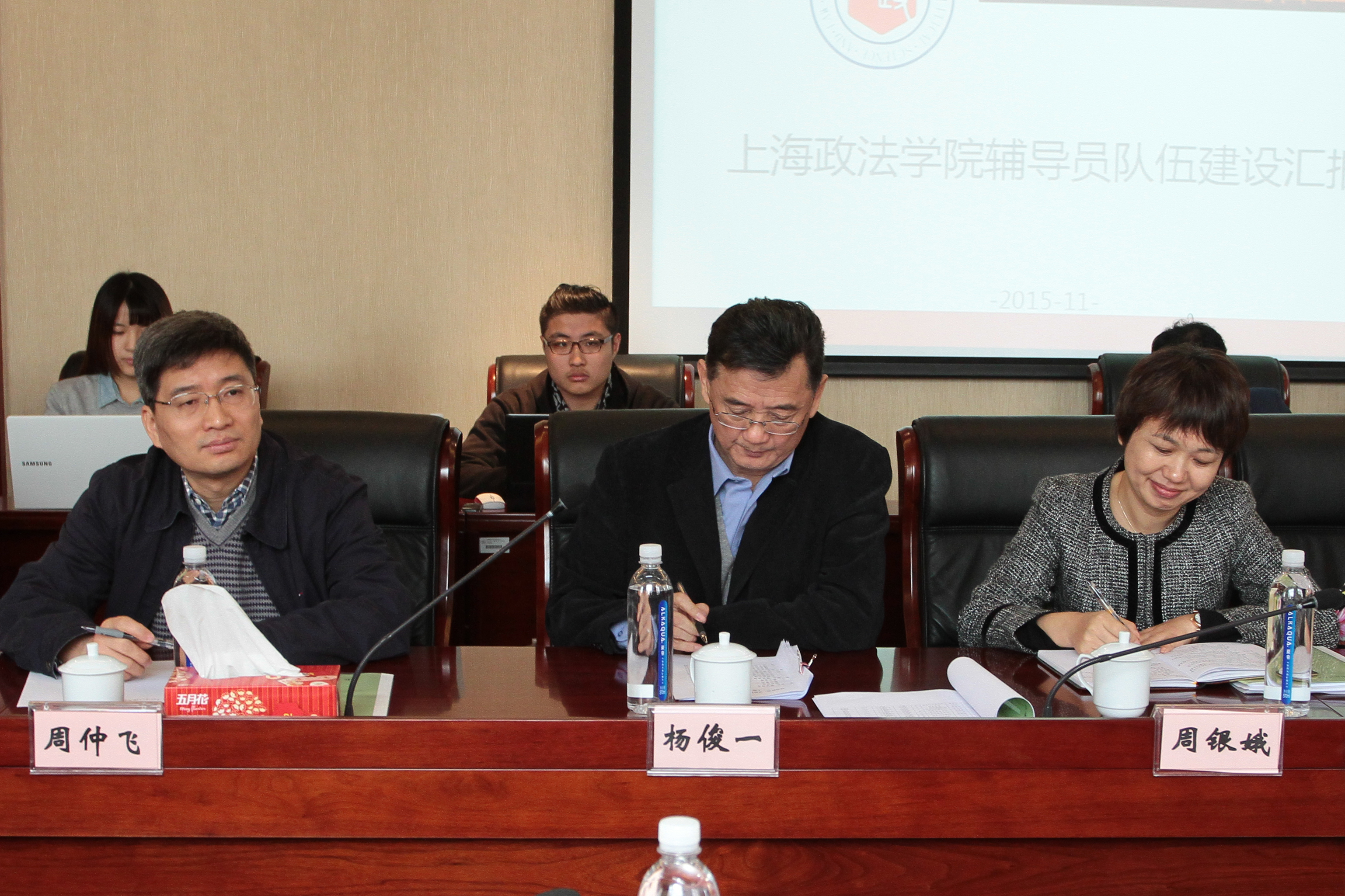11月11日上午,上海高校辅导员队伍建设工作督查组一行七人在组长上海震旦职业学院党委书记黄晞建,副组长上海大学组织部部长王军华的带领下来校检查指导工作。我校党委书记杨俊一,校长周仲飞,党委副书记、副校长周银娥及相关职能部门和马克思主义学院的主要负责人参加了会议。