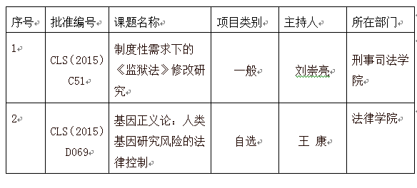 近日,中国法学会对2015年度部级法学研究课题经过资格审查、专家评审,最终,批准立项课题287项,其中:重大课题2项,重点课题12项,一般课题91项,青年调研课题24项,自选课题158项。我校教师喜获2项课题立项(具体见下表)。(于智慧 撰稿)