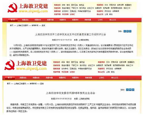 近期,上海教卫党建网,相继以“上海政法学院召开二级学院党总支书记抓基层党建工作述职评议会”、“上海政法学院党委召开2015年度民主生活会”为题,专题报道我校党建工作。