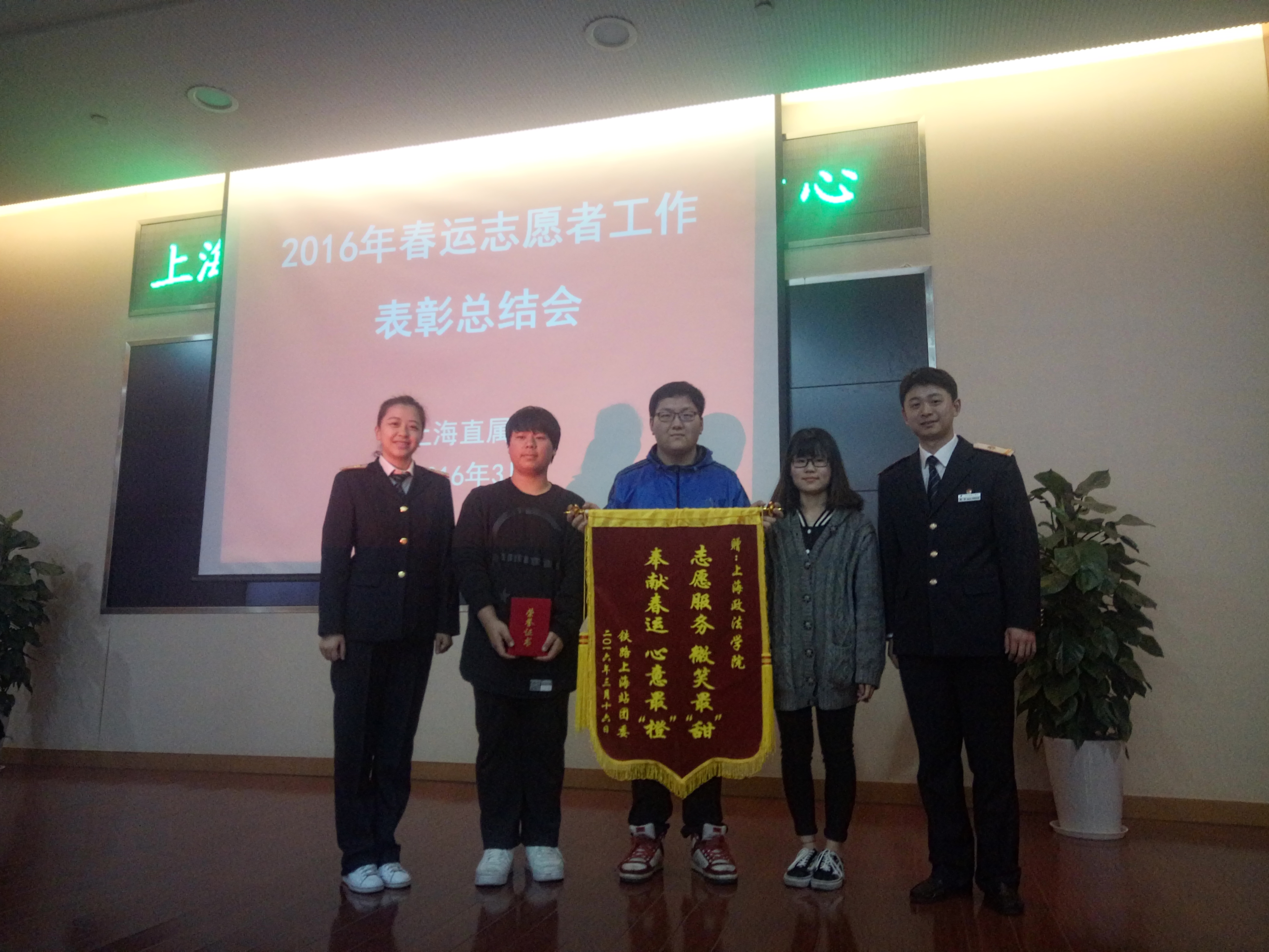 3月16日下午,上海铁路局上海站2016年春运志愿者工作总结表彰会在上海火车站会议室召开。由校团委主办,高职学院团总支承办的上政春运志愿者服务队以认真负责的态度、吃苦耐劳的精神、热心周到的服务得到了铁路上海站的充分肯定。