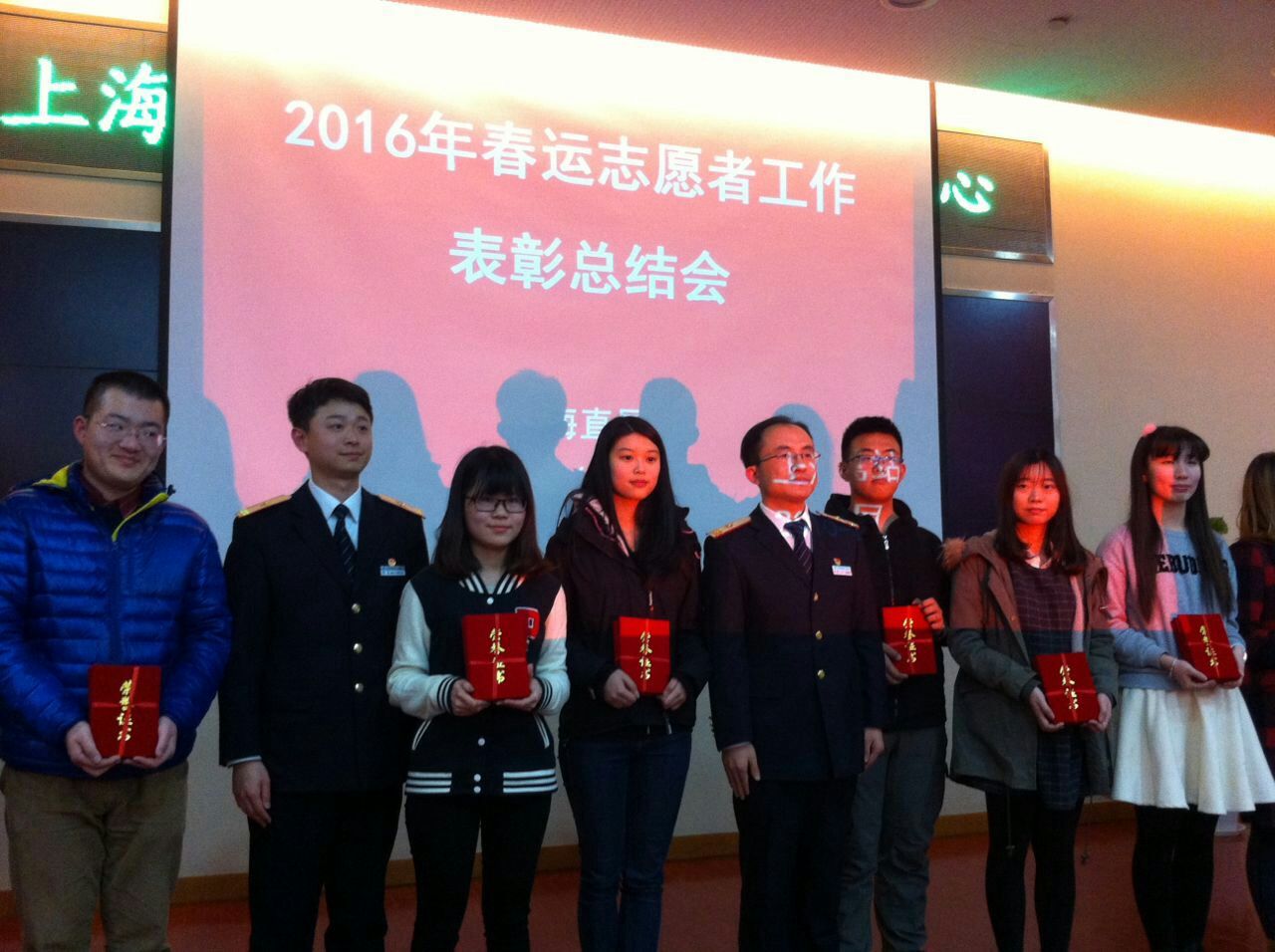 在此次表彰中,我校优秀志愿者吴婷、高若瀚、刘思琪、朱佳雯获得2016年铁路上海站50佳春运优秀志愿者荣誉称号,其他同学也获得了春运志愿者服务证书。