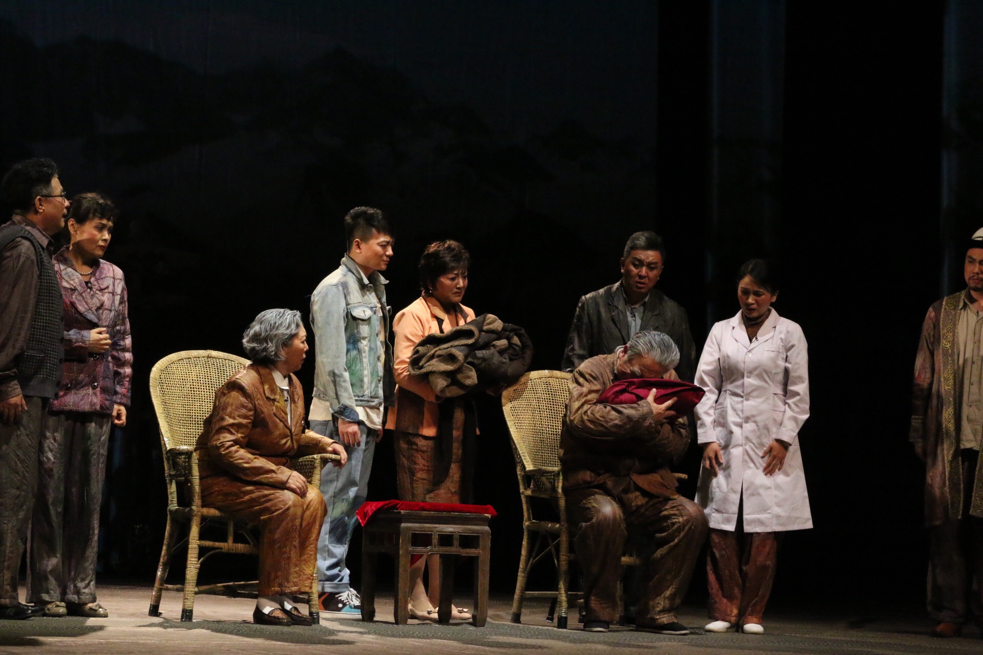 舞台上,演员们全情投入,用饱满真挚的感情演绎悲欢离合,拷问生命的价值与意义,每分每秒都在冲击观众视听,震撼观众心灵,刺激观众泪腺。主演董怀玉年近七旬,当他用颤抖的身姿、沙哑的声音、孱弱的背影一声声诉说对儿女的亏欠时,让大家切身感受兵团人对誓言的坚守、对祖国的忠诚以及对生命价值的尊重。演出感人至深,叩人心弦,掌声经久不息。