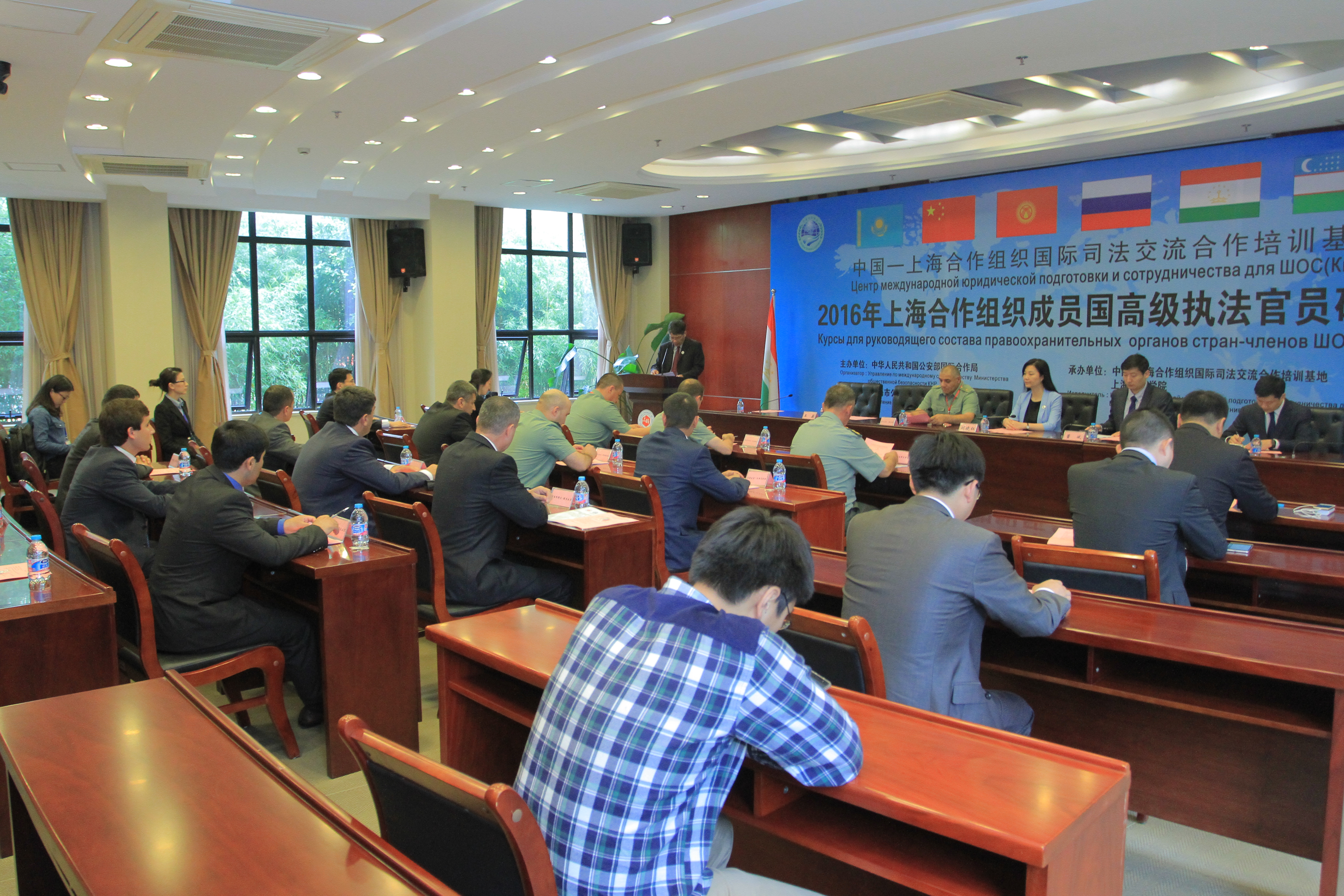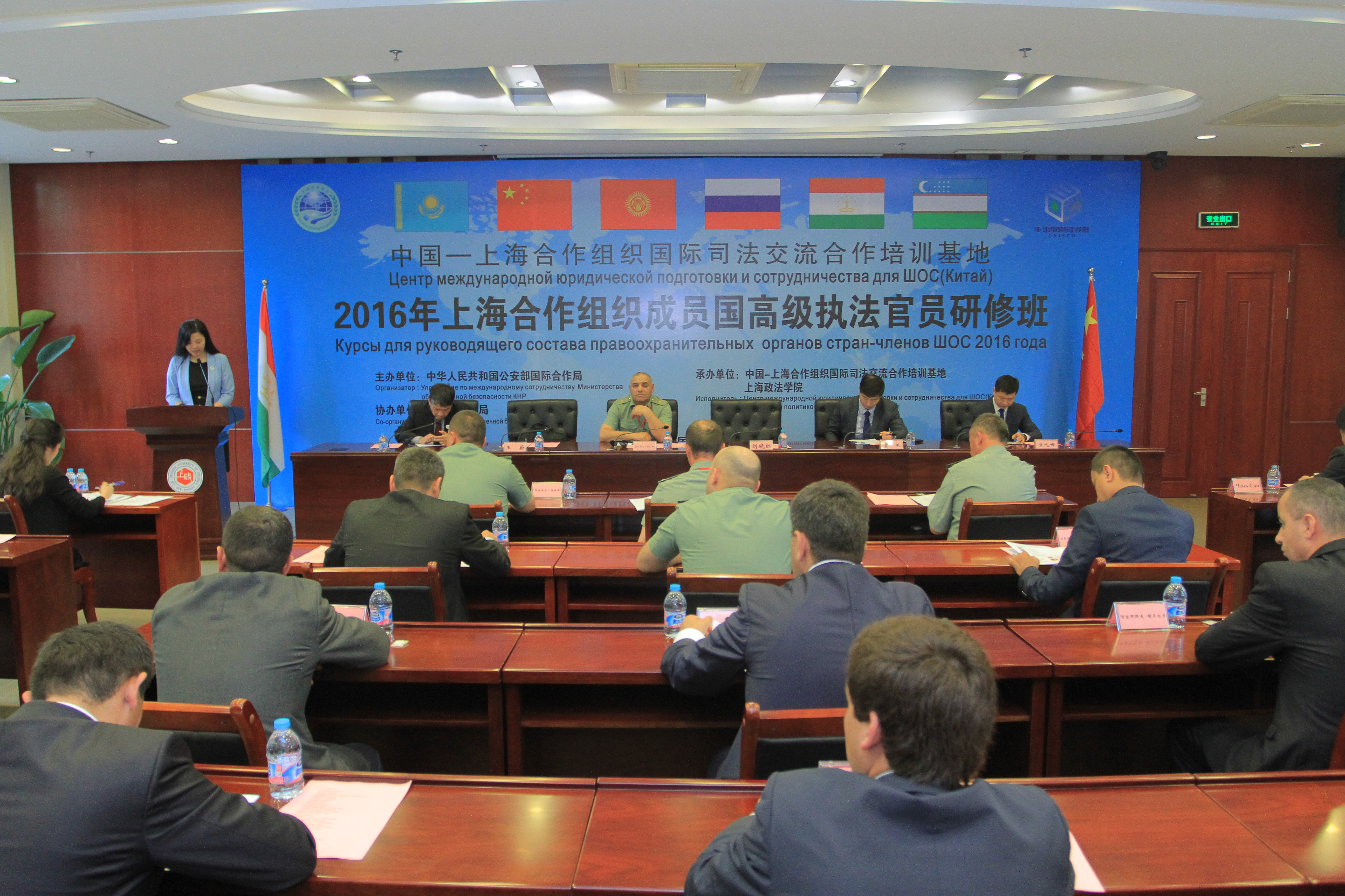 5月20日,由公安部国际合作局主办、上海市公安局协办、中国-上海合作组织国际司法交流合作培训基地(下称“培训基地”)承办的“塔吉克斯坦国安委警务决策与管理研修班”开班典礼在我校隆重举行。该培训班是2016年我校承担的首个外警培训班,系公安部本年度外警培训重要班次。塔吉克斯坦霍巴肖夫少将,上海政法学院校长刘晓红,上海市公安局指挥部副主任董斌、国际合作处副处长朱屹峰,以及塔吉克斯坦15名官员出席了开班典礼。开班典礼由培训基地协调员、上海政法学院国际交流处处长王蔚主持。