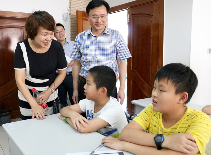 在青浦区实验小学“爱心暑托班”的走访过程中,周书记察看了暑托班的周围环境设置,仔细询问了“爱心暑托班”的办班方案、课程设置、食品安全、人员配备等情况,并与暑托班的志愿者与小学生们进行了互动与交流。我校志愿者受到了小朋友们的热烈欢迎:“我很喜欢这些姐姐,和姐姐们一起玩很开心!”暑托班里的一名小学生手舞足蹈地说道,脸上绽满了笑容。