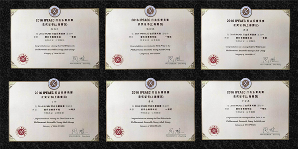 2016IPEAEC打击乐菁英赛由IPEA国际打击乐教育协会主办。中国音乐学院教授王以东、天津音乐学院民乐系主任王满、四川音乐学院现代器乐系教授王满、沈阳音乐学院教授吕青山、上海音乐学院教授杨茹文等担任此次大赛的评委和常务理事。本次比赛设有少年组、青年组。比赛项目设有马林巴、小军鼓、爵士鼓、中国民族打击乐器及合奏组。赛前,在专业老师蔡慧琼的辛勤指导下,学子们积极筹备比赛,刻苦练习。最终,在有众多高校参与、高手云集的比赛中脱颖而出,获得一等奖的好成绩。