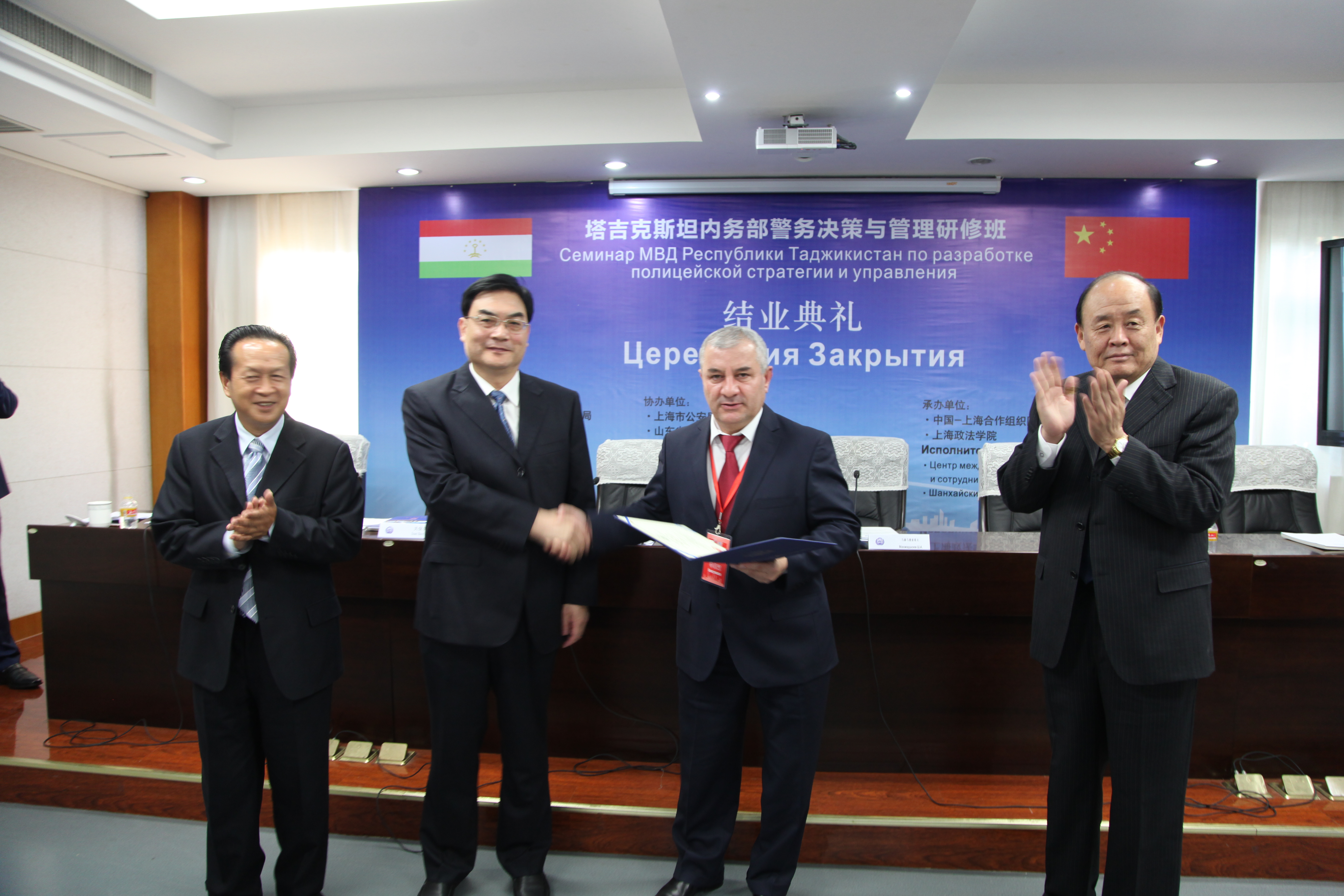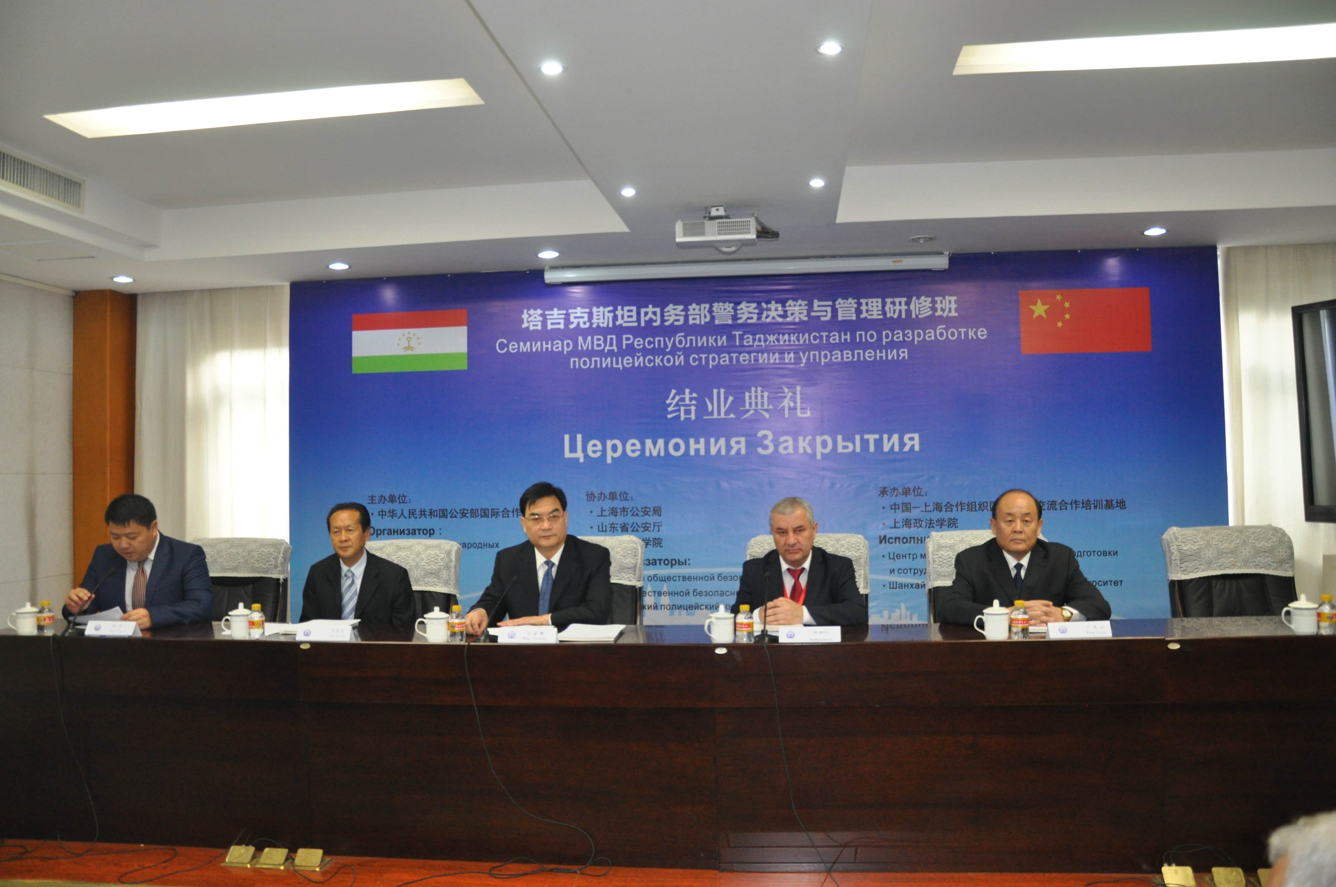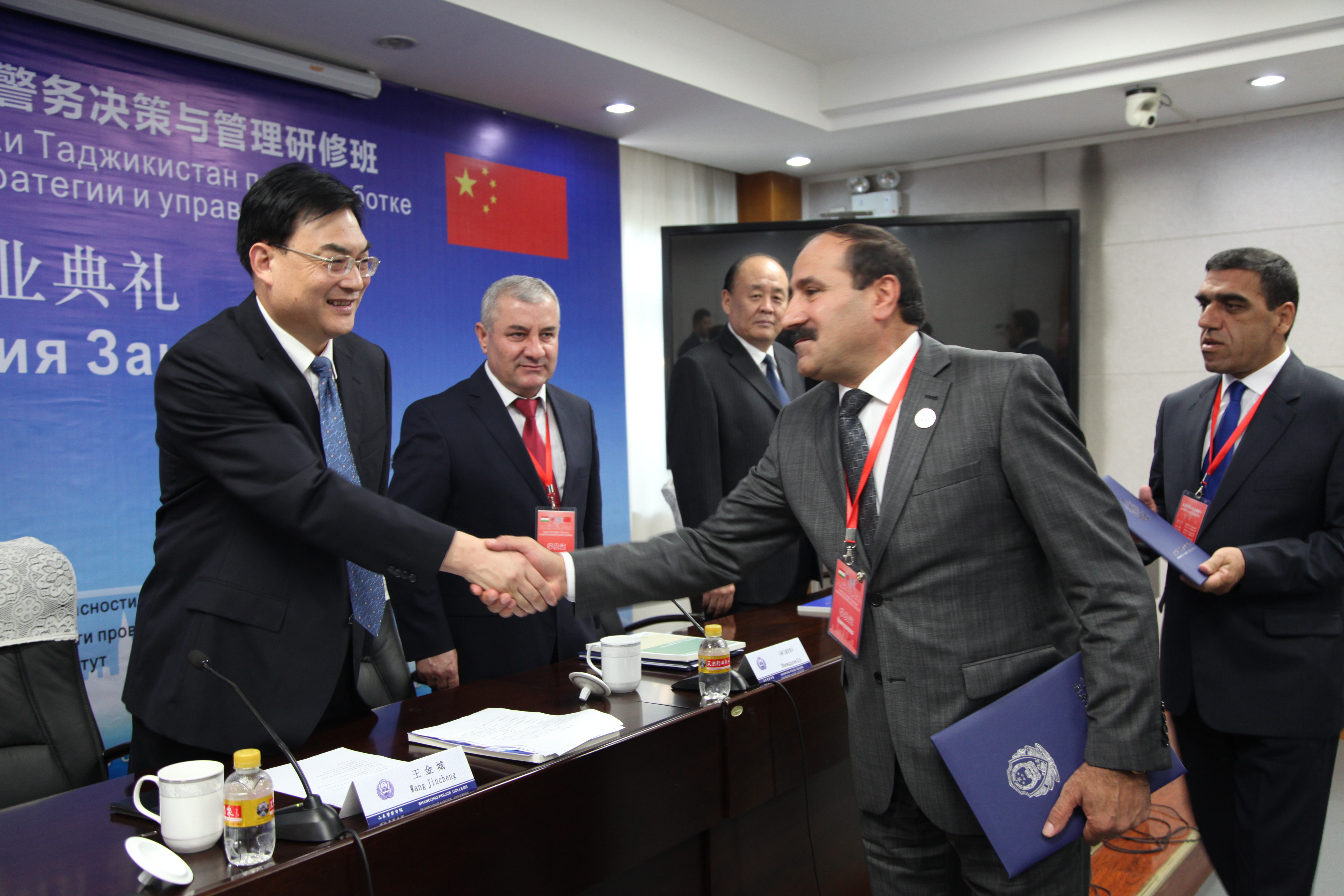 2016年9月19日,塔吉克斯坦内务部警务决策与管理研修班结业典礼在山东警察学院隆重举行。出席典礼的中方人员有山东省公安厅副厅长王金城,上海政法学院副校长关保英,山东警察学院副院长王离京等。中国-上海合作组织国际司法交流合作培训基地(简称“培训基地”)建设办主任陈校主持结业典礼。