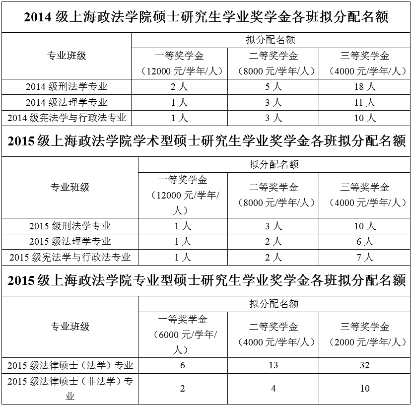 请申请者自行下载《上海政法学院2015—2016学年“研究生学业奖学金”申请表(2014、2015级学术型硕士)》(附件2)、《上海政法学院2015—2016学年“研究生学业奖学金”申请表(2015级专业型硕士)》(附件3),按要求填写,并附相关证明材料,以班级为单位交至法学楼B1-314,逾期不予受理。