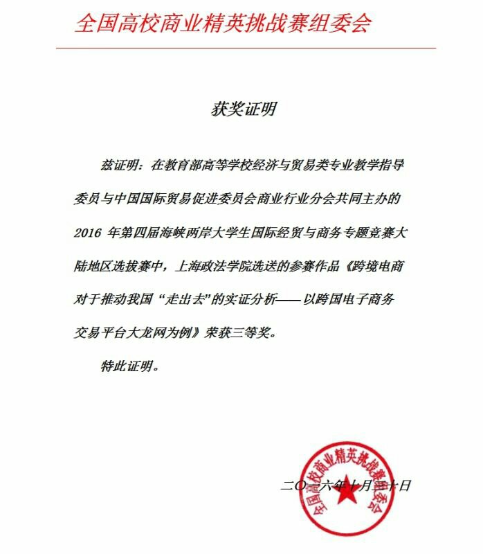 在刚刚结束的第四届海峡两岸大学生国际经贸和商务专题竞赛大陆地区选拔赛中,我校经济管理学院申蕾老师指导的两支参赛队伍分别获得了一等奖和三等奖的佳绩。2014级国际经济与贸易专业王思美、刘尚、柯梦佳、王诗钰四位同学完成的作品《ECFA协议下大陆对台湾农业经济影响的实证分析》获得大陆赛区一等奖。2014级国际经济与贸易专业叶荪静霖、何冰凌、吴兴洁和2015级经济与金融专业胡榆铃四位同学完成的作品《跨境电商对于推动我国“走出去”的实证分析——以跨国电子商务交易平台大龙网为例》获得大陆赛区三等奖。