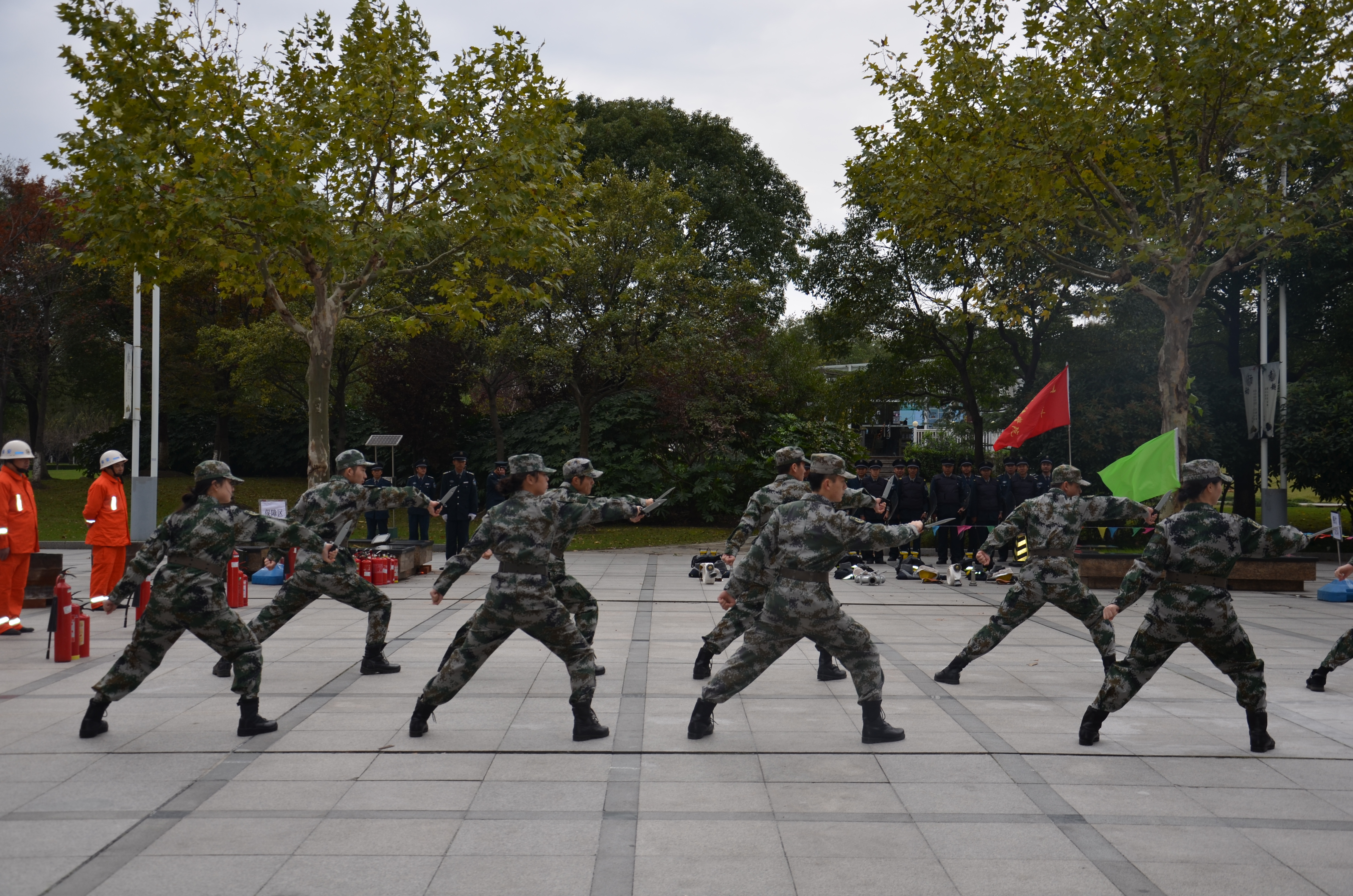 第二阶段是安保技能汇报演示及消防技能演练。我校保卫队员和退役复学大学生分别进行了队列训练和交通指挥手势、警棍盾牌术、匕首操等4个课目的表演。寒风中,队员们个个精神抖擞、英姿飒爽,威武的身姿和精湛的技艺,博得了阵阵热烈掌声。