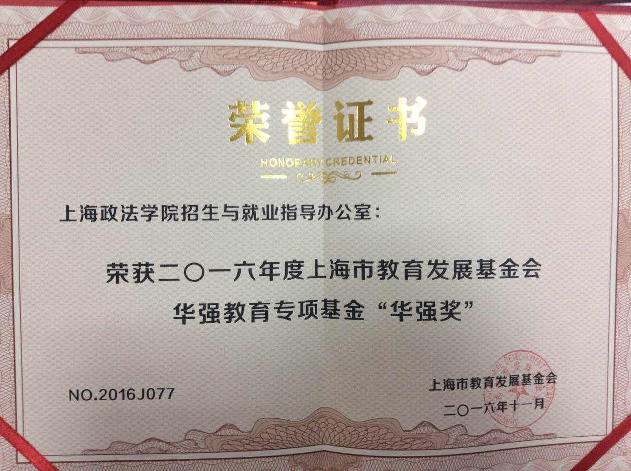 11月8日,由上海市教委、上海市教育考试院和上海市教育发展基金会华强教育专项基金联合举办的首届“华强奖”颁奖大会在上海体育学院隆重举行。我校招生与就业指导办公室荣获2016年度“华强奖”荣誉称号。