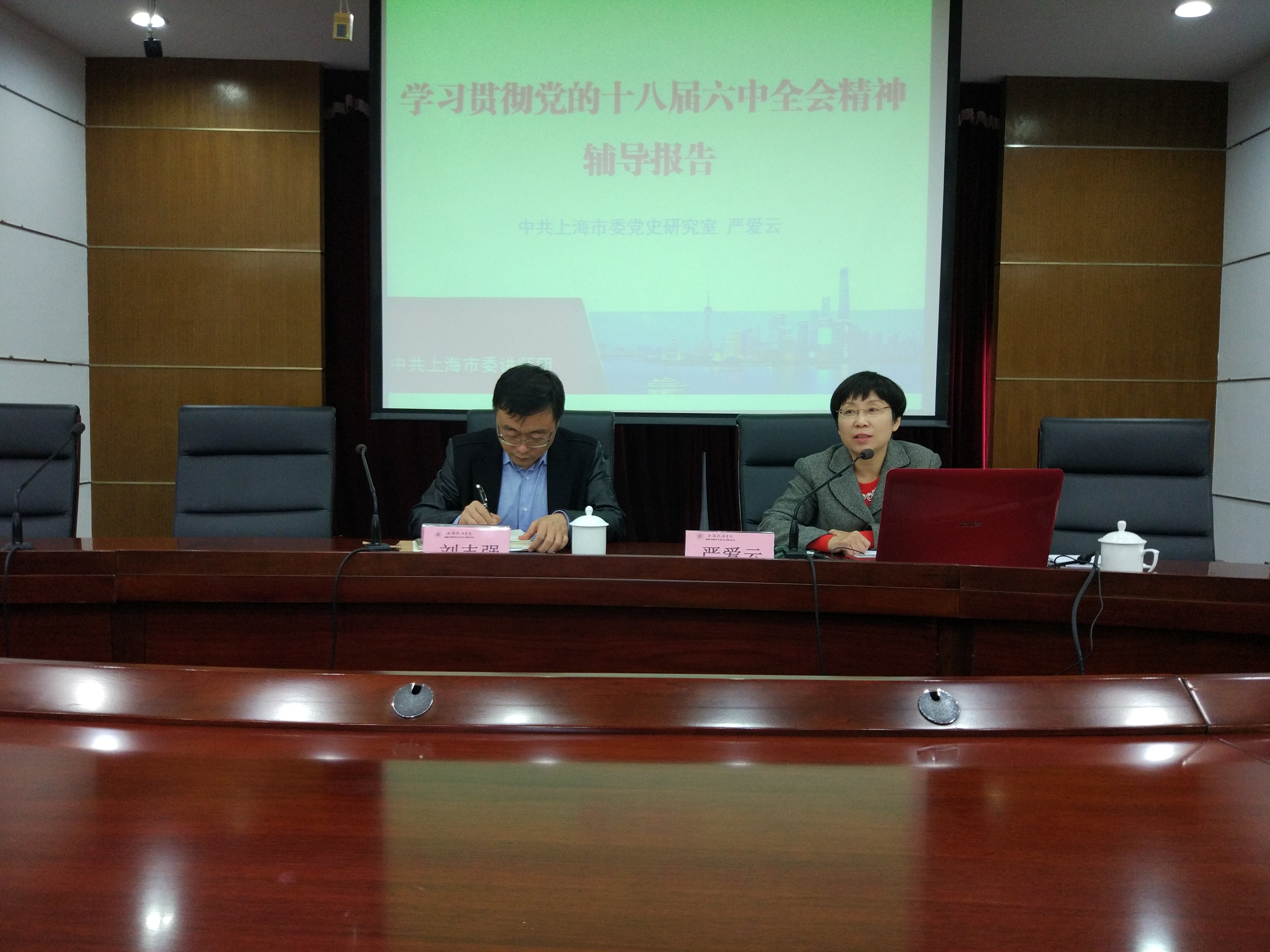11月22日下午,学习十八届六中全会精神辅导报告会在求实楼513会议室举行,此次报告会邀请上海市学习贯彻党的十八届六中全会精神宣讲团成员、市委党史研究室副主任严爱云做专题辅导报告。报告会由机关第二党总支书记、学生工作部(处)部(处)长刘志强主持,机关第二党总支成员及部分学工人员参加学习。