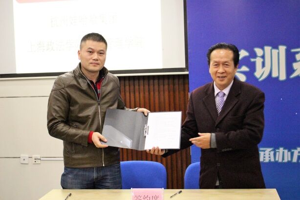 在回顾娃哈哈实战营销大赛视频后,刘宗其、易小兵、刘宪为营销实践大赛颁奖。为提升我校学生的营销意识和能力,促进校企双方的深入合作,关保英与刘宗其在校企共建仪式上签署了合作协议。随着协议的签署与授牌完毕,经管学院的教学实践单位达到了41家。