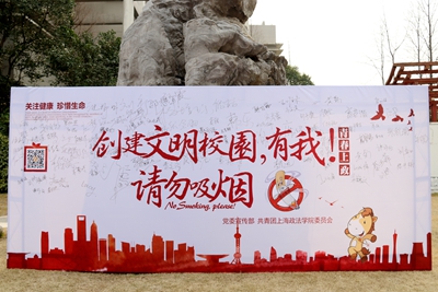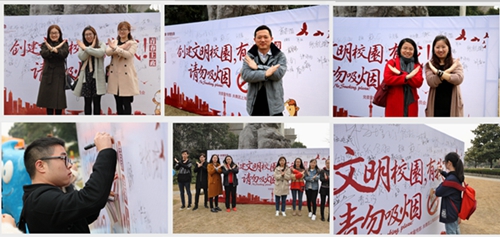 3月1日中午,由党委宣传部和校团委联合主办的禁烟签名活动在世博广场举行。党委宣传部、校团委、各二级学院分团委老师以及各学院主要学生干部和团支部书记纷纷聚集在签名板前,郑重地签下自己的名字:“创建文明校园,禁烟有我”!面对小记者的镜头,大家纷纷做出禁烟的手势,成为一名禁烟志愿者,表明抵制公共场所吸烟的决心。