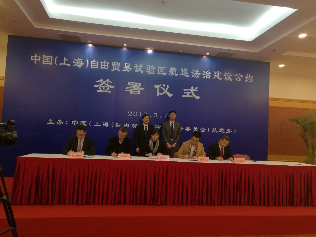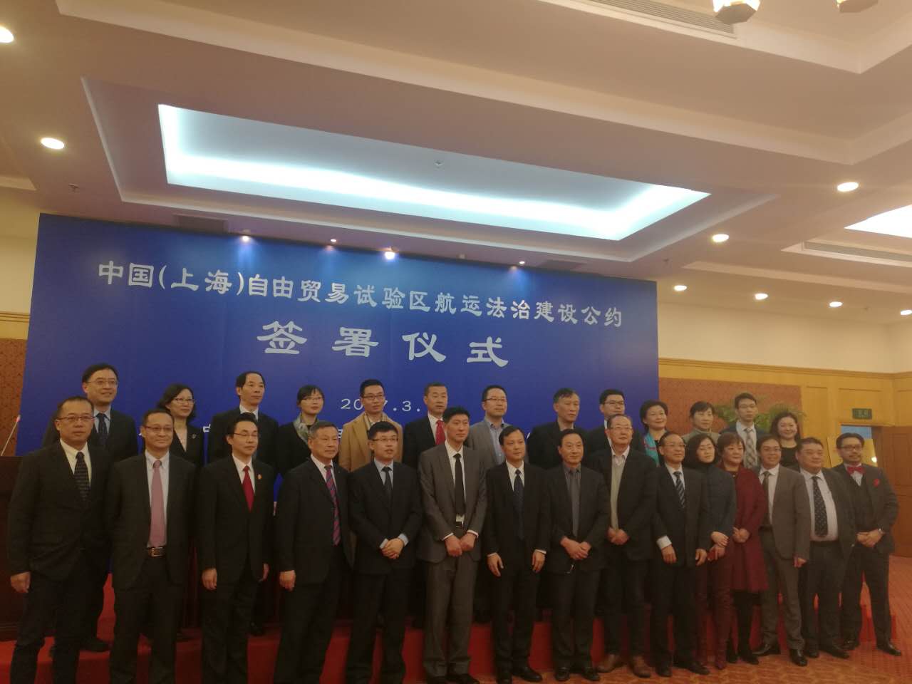3月7日上午,《中国(上海)自由贸易试验区航运法治建设公约》签署仪式在浦东新区办公中心隆重举行。签署仪式由浦东新区商务委员会陆启星副主任主持,市交通委张林副主任作主题发言,并与浦东新区陈希副区长一起见证了签约仪式。国际法学院副院长王祥修教授和刘恩媛副教授代表我校出席了仪式。