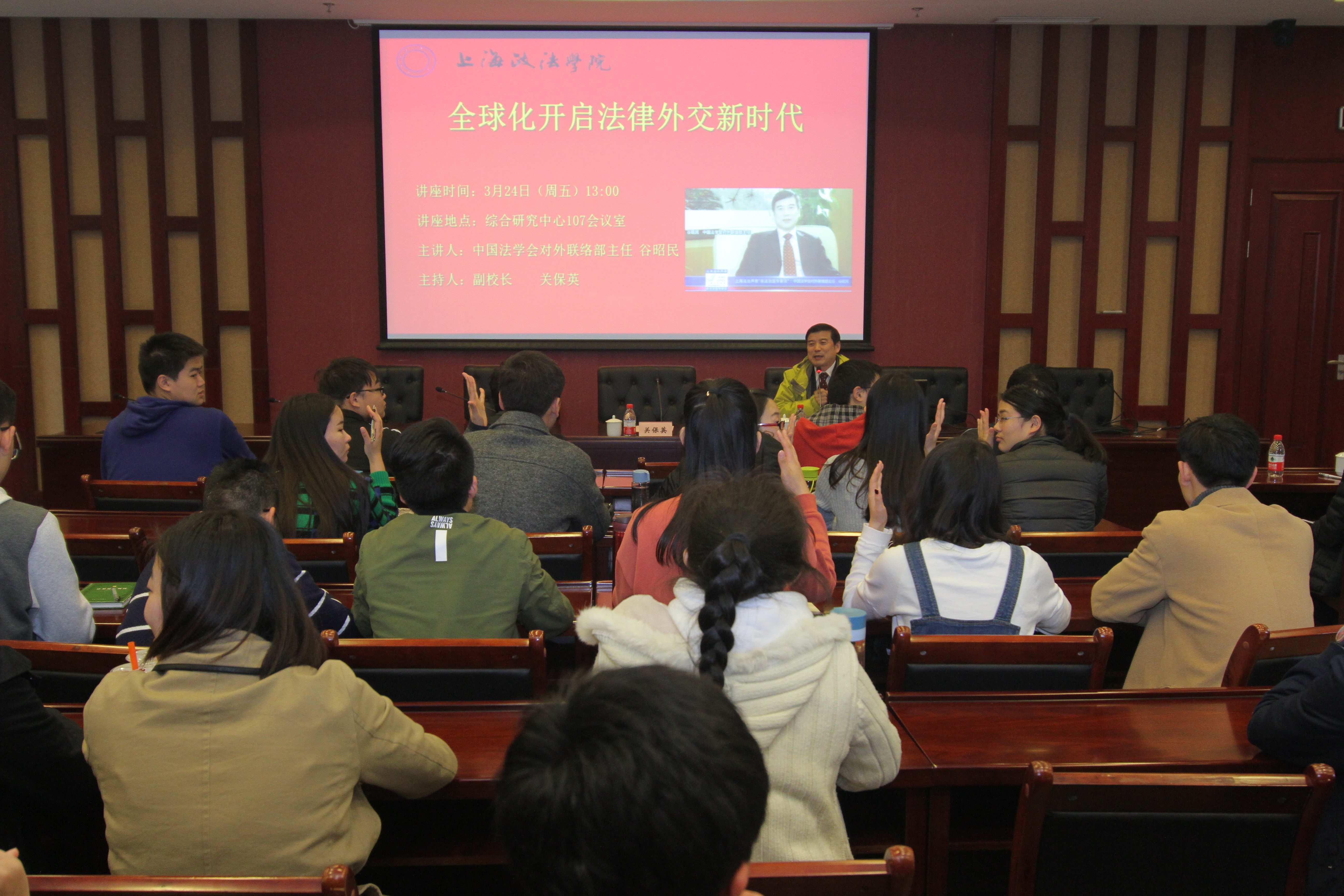 讲座中,谷昭民介绍了我国开展对外法律交往的情况。目前,世界上已经有100多国家和地区的800多个组织签署了法律合作备忘录;建立了覆盖全球的十二个区域性法律论坛,上海政法学院参加了其中的中国-亚欧法律论坛;还成立了30多个研究中心、培训基地等合作机制。