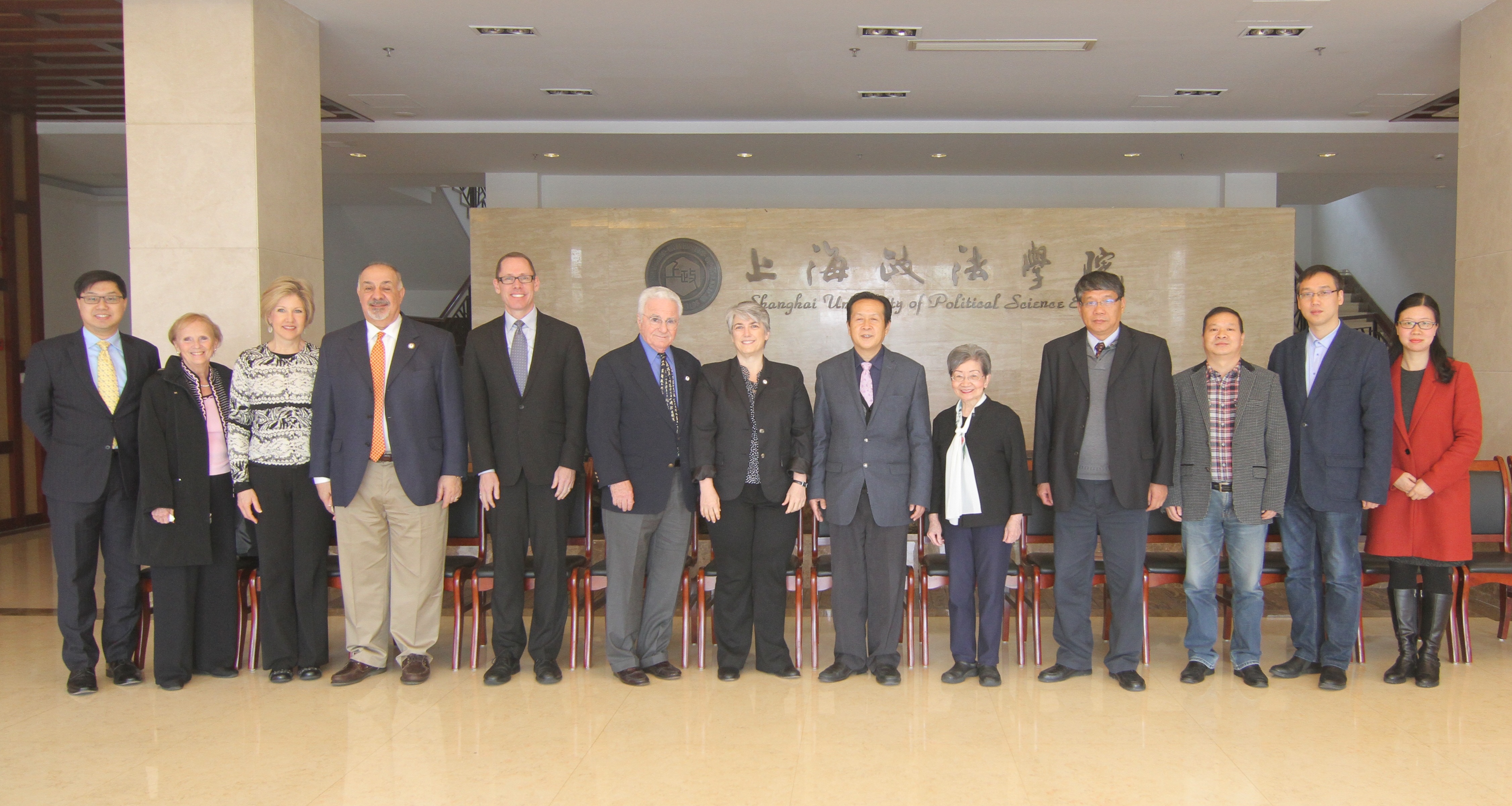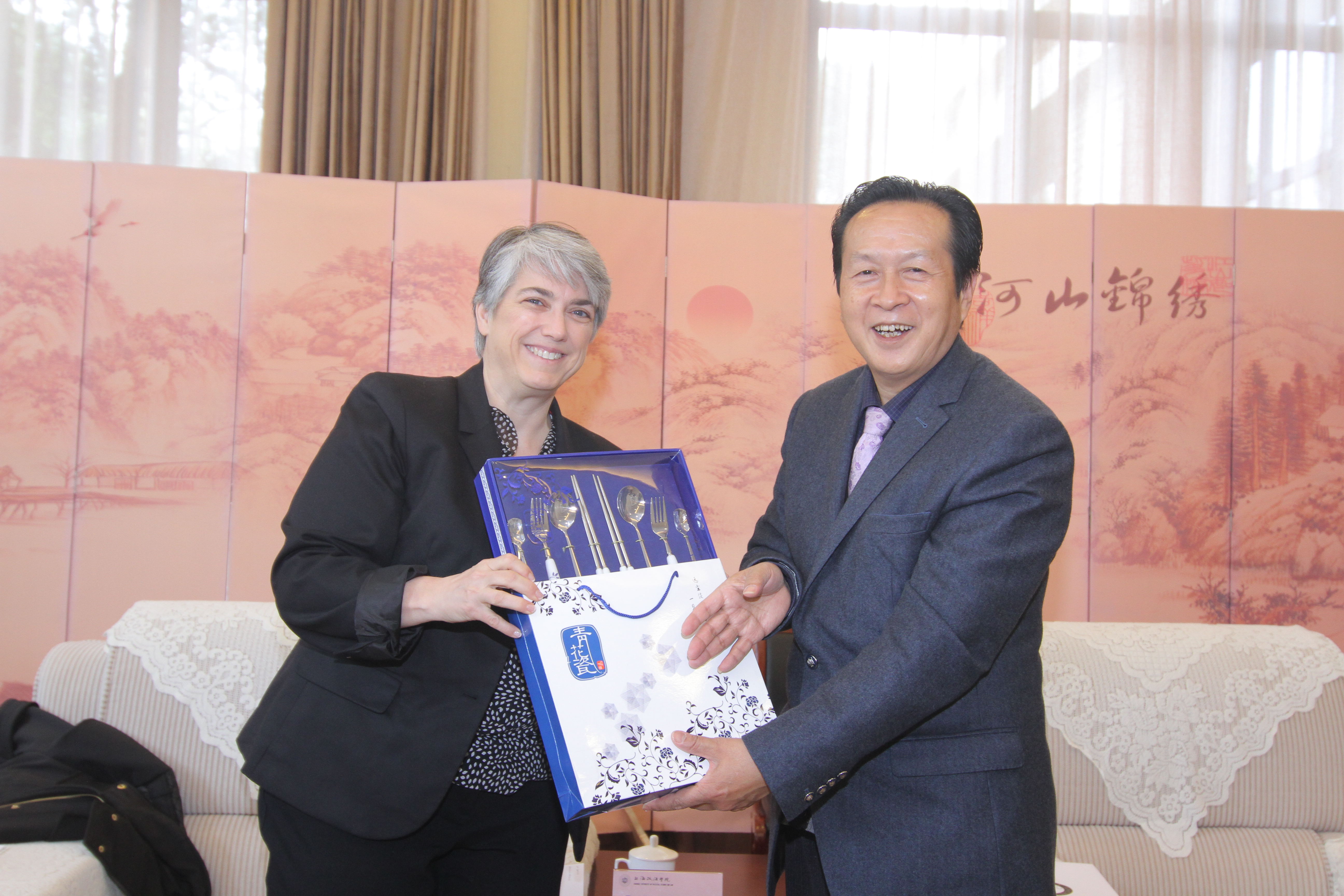 关保英介绍了我校的基本情况,重点介绍了我校在人才培育、学术科研、服务社会等方面所取得的成绩。Darby Dickerson介绍了约翰•马歇尔法律学校的相关情况,表示非常重视与中国高校法学院的合作交流。会后,双方互赠礼物,并合影留念。随后,约翰•马歇尔法律学校代表团一行参观了我校模拟法庭、图文信息中心。