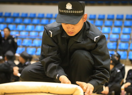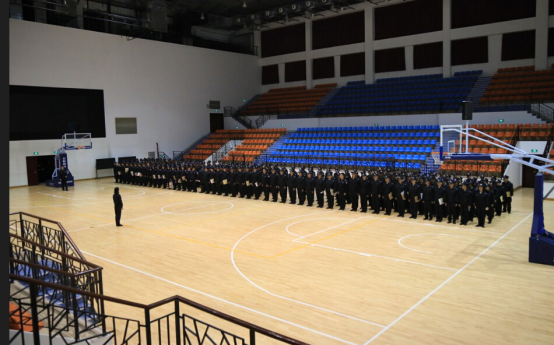 夜幕降临,训练还在继续。28日晚,带训教官在比赛馆为各位新干警学员做内容示范演练。他们身着统一服装,迈着整齐的步伐,气势逼人。