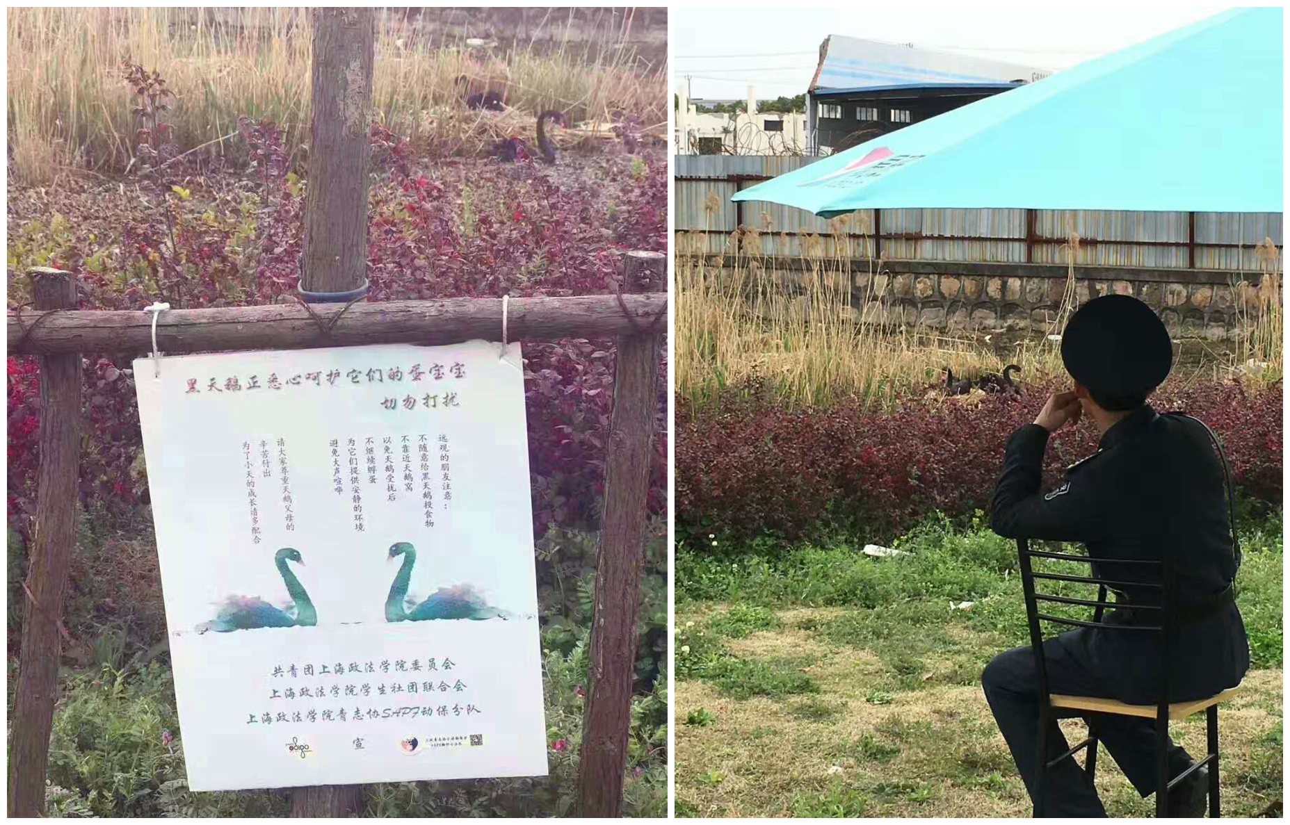 青年志愿者协会的同学们也主动加入到了保护天鹅宝宝的行动中来。最初,他们以微信打卡的方式守护在天鹅蛋的身边,待到天鹅宝宝降生后依旧没有放松下来,他们用实际行动给予了天鹅夫妇最诚挚的守护与祝福,只愿天鹅宝宝能够健健康康、快快乐乐地长大。