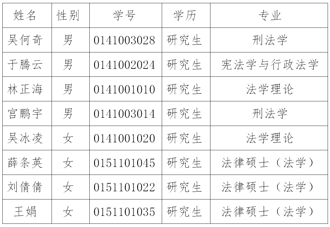 按照沪教委学〔2017〕18号《上海市教育委员会关于做好2017年度上海市普通高等学校优秀毕业生评选工作的通知》要求,我校2017年度研究生毕业生总人数为162人,评选比例以研究生、本科生不超过应届全日制毕业生人数的5%,我校研究生优秀毕业生的名额为8个。依据《上海政法学院上海市优秀毕业研究生评选工作实施细则》,经研究生处上海市优秀毕业生评选小组评议决定,现将上海市优秀毕业生评审结果公示如下: