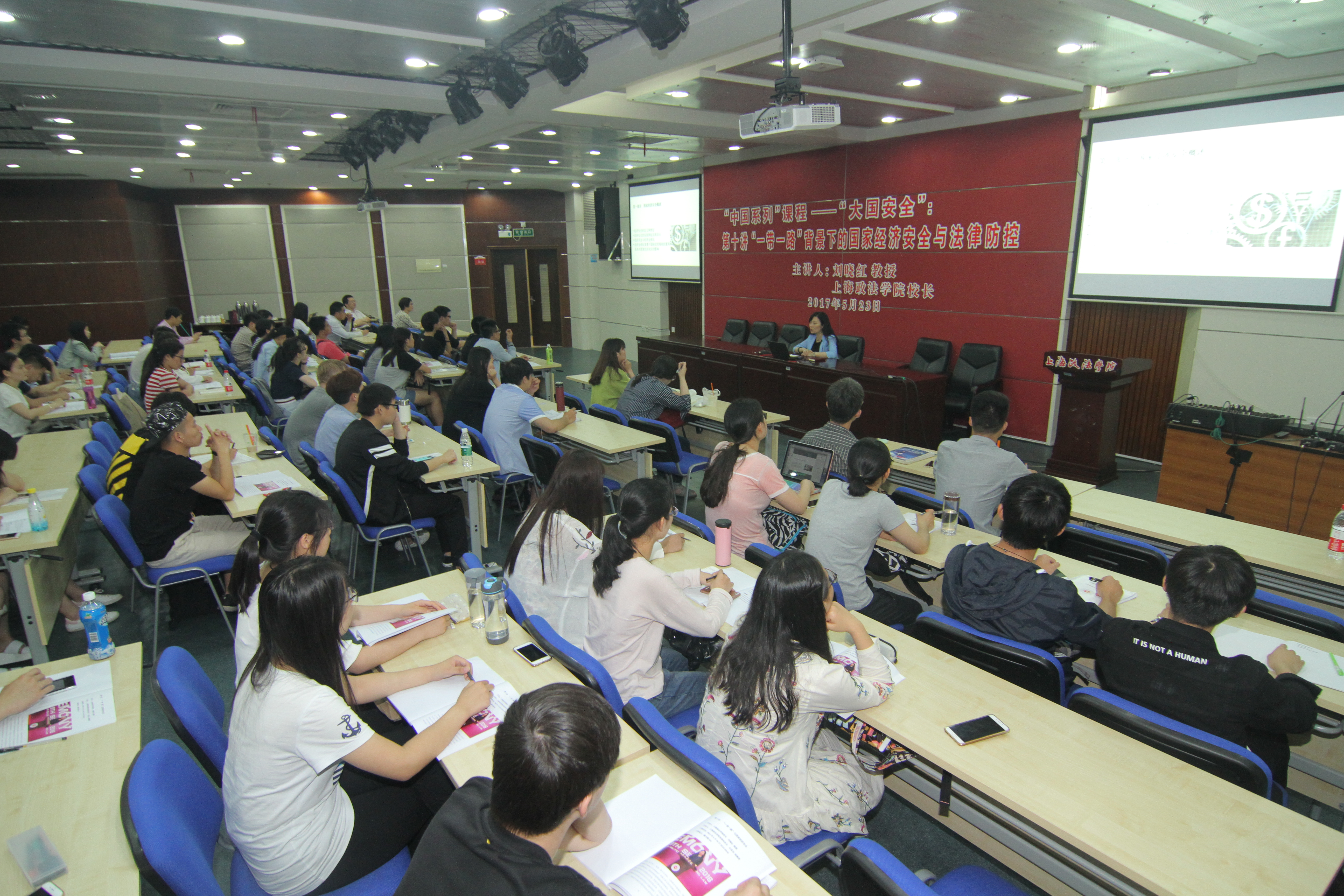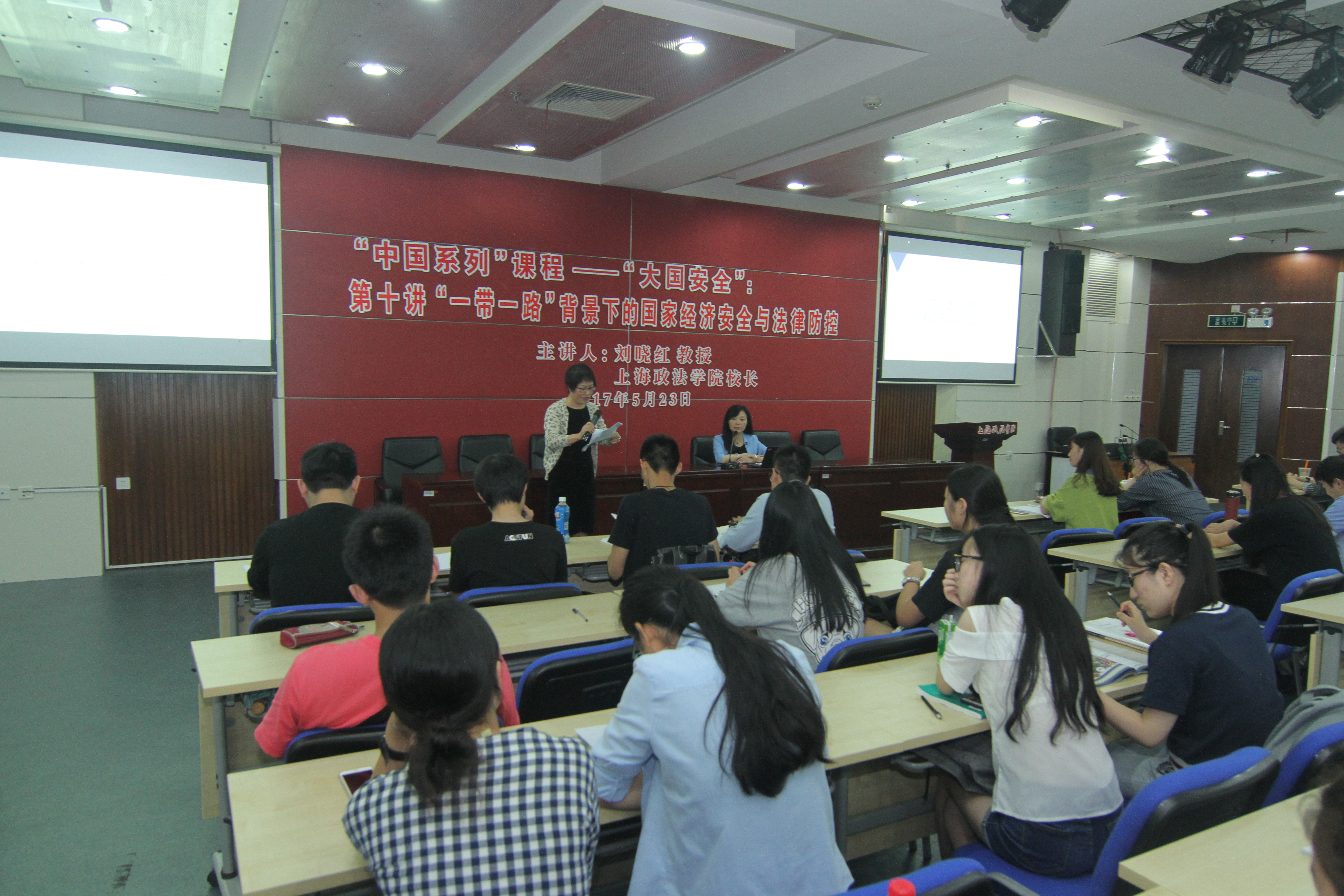5月23日晚,上海政法学院校长刘晓红教授围绕“‘一带一路’背景下的国家经济安全与法律防控”主题为《大国安全》课程做讲座,国际法学院王丽华教授主持讲座与互动。