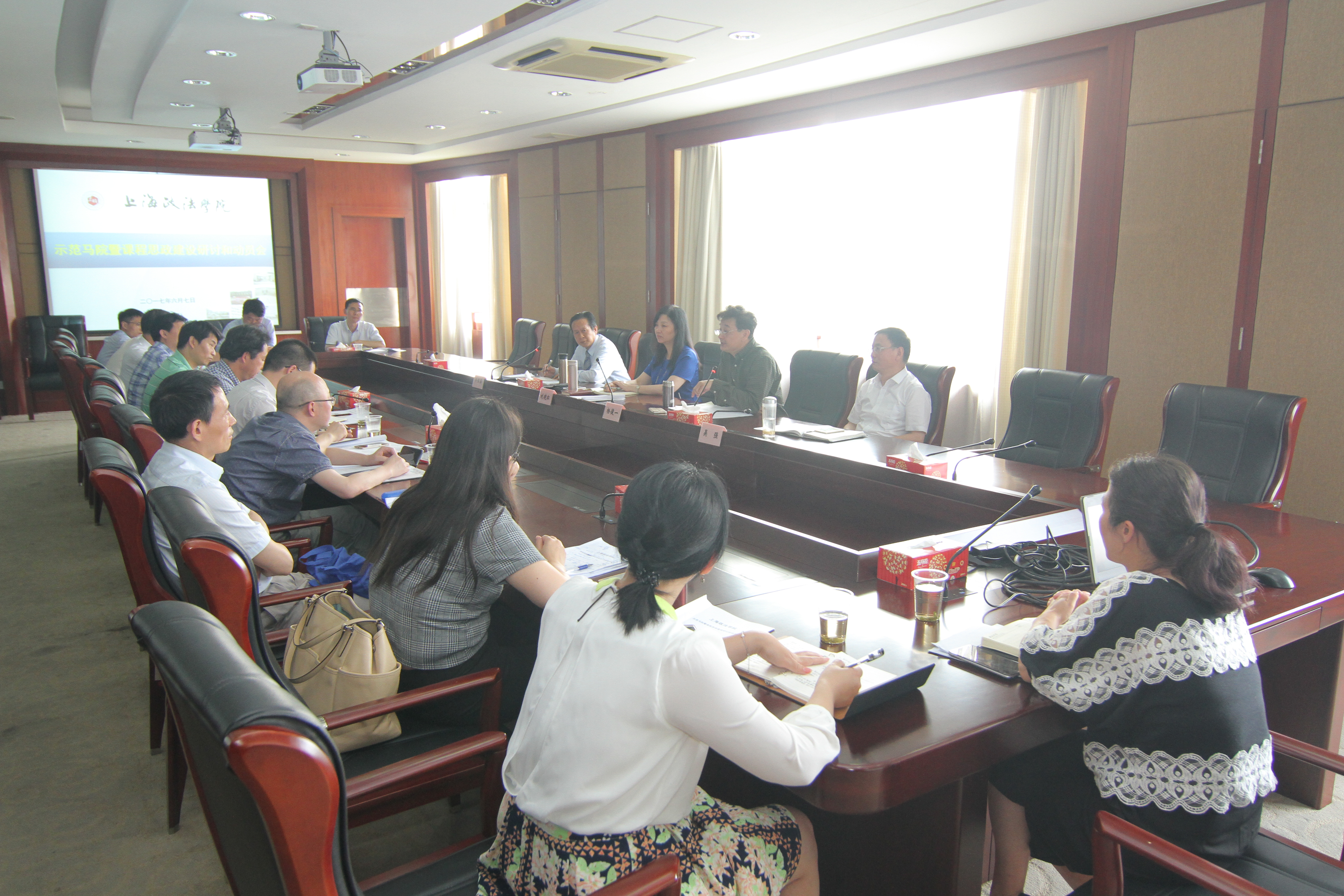 为深入学习贯彻全国和上海高校思想政治工作会议精神,更好地完成立德树人的根本任务,6月7日下午,学校在求实楼413会议室召开了马院暨课程思政建设研讨和动员会。校党委书记杨俊一、校长刘晓红、校党委副书记吴强、副校长关保英等出席会议,教务处、马克思主义学院、发规处(高教所)、质管办、计财处、科研处、宣传部、国务学院等部门负责人和教师代表参加了会议。会议由关保英主持。