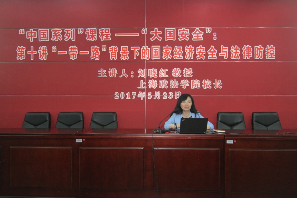 2017年5月23日晚,上海政法学院校长刘晓红教授以“‘一带一路’背景下的国家经济安全与法律防控”为主题,讲授《大国安全》第十课,国际法学院王丽华教授主持讲座与互动。