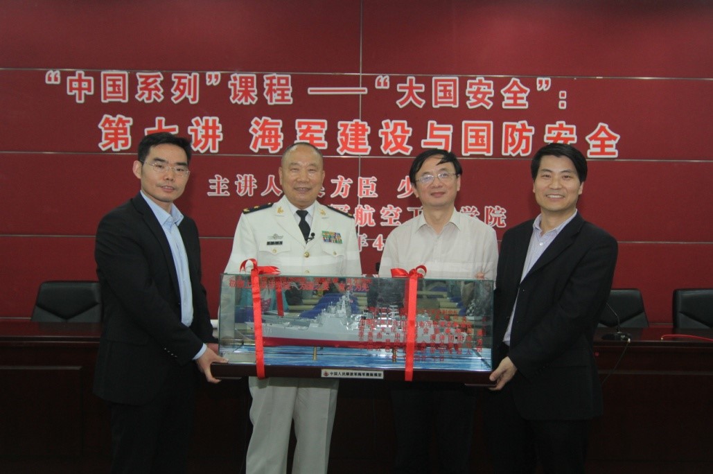 2017年4月25日,海军航空工程学院原副院长、海军少将吴方臣应邀来校以“海军建设与国防安全”为主题,讲授《大国安全》第七课,上海政法学院经济法学院副院长杨华教授主持讲座与互动。