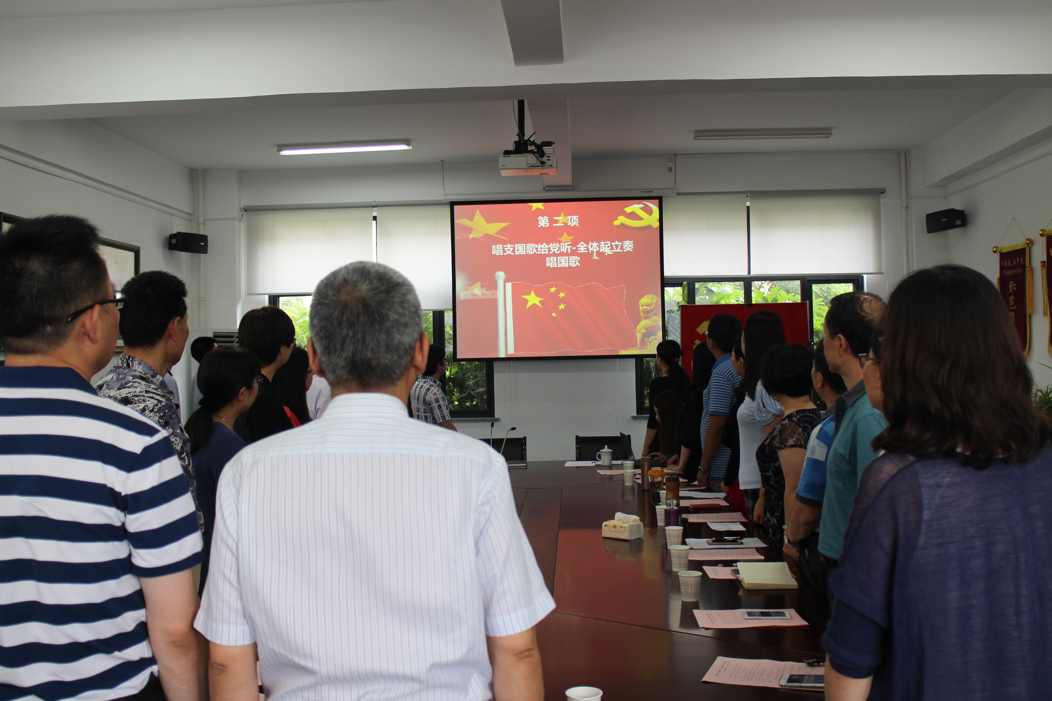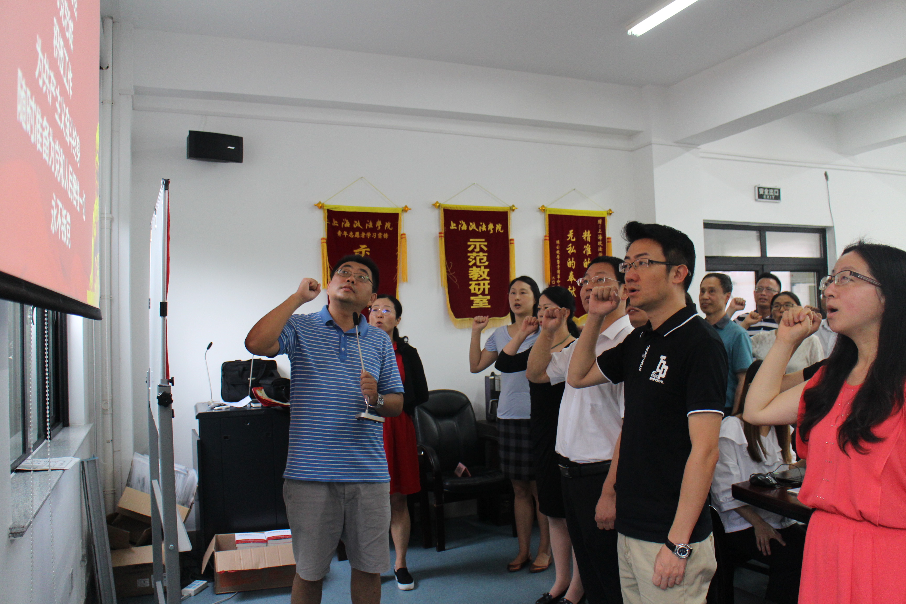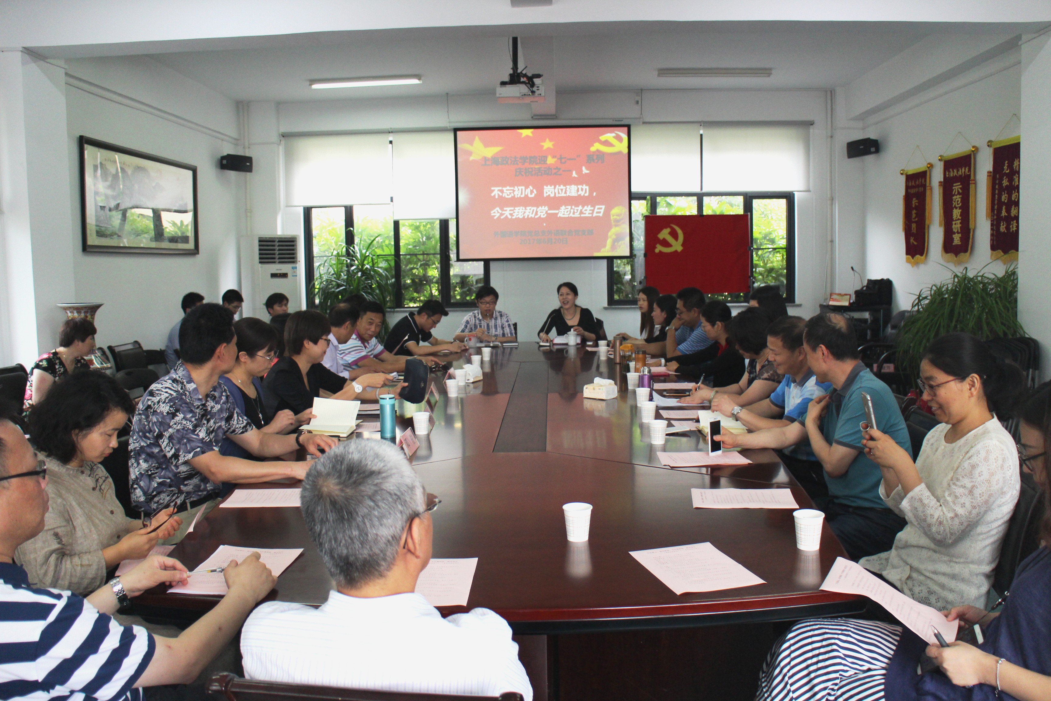 为贯彻落实上海市第十一次党代会精神,推进“两学一做”学习教育常态化制度化,激励党员在学院发展中更好地发挥示范引领作用,党委组织部、外国语学院党总支外语联合党支部于6月20日上午举行“不忘初心,岗位建功,今天我和党一起过生日”主题党日活动,共同回顾党的96年光辉历程,迎接党的生日。学校党委组织部部长王静、副部长张东霞,各学院党总支书记、组织员,部分教工党支部书记,外国语学院党总支书记姚善英以及全体教工党员参加了此次活动。活动由外语联合党支部书记洪令凯主持。