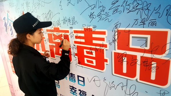会后,嘉宾与同学们在禁毒宣传板上郑重签名,留下庄严的承诺。禁毒社作为我校特色社团,发挥专业特长,工作深入社区和课堂,目前正在编纂针对未成年人保护的禁毒主题漫画册,作为我校小学生“爱心暑托班”志愿者的使用教材,将覆盖青浦区所有暑托班的小学,该项目已获得市红十字会的支持,是“博爱申城”志愿服务工作的一部分。将来,禁毒社还将在关注涉毒家庭子女、高危群体跟踪帮教、禁毒拓展教育、禁毒宣传科普资料制作、禁毒专题片和课件制作等方面,开展进一步的探索和尝试。(杜欣月、杨万佳撰稿 卫嘉君摄影)