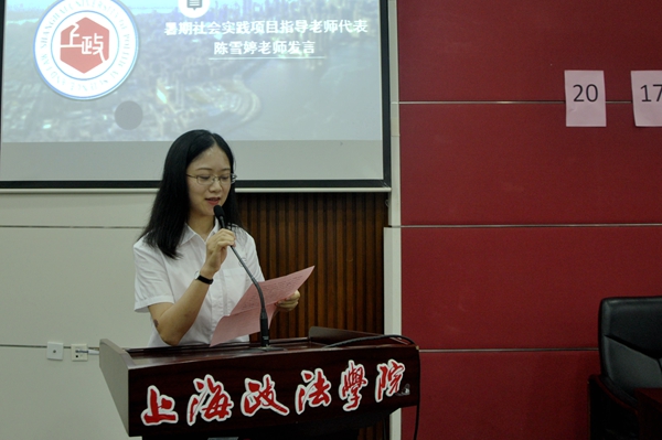 最后,周银娥宣布上海政法学院2017年暑期社会实践团队出征并做总结讲话。她对今年社会实践富有特色的选题和精心筹划的组织工作表示了肯定,为了深入贯彻落实高校思政工作会议精神,我校今年首次探索建立学生社会实践学分制,要大力组织师生参加社会实践活动,了解体验国情市情民情,促进师生培育和践行社会主义核心价值观。她指出,各级团组织要始终思考“培养什么人、怎样培养人”的重要命题,充分搭建社会实践的平台;第二,要立德树人、德法兼修,充分发挥社会实践的育人效应;第三,要注重培养学生知行合一,在实践中培育学生的社会责任感;第四,要完善实践育人的制度建设,强化保障。今年我校在实践育人的制度上已有了新的尝试,将社会实践、志愿服务纳入学分。希望能不断完善实践运作机制,做好实践团队的过程管理、质量管理和安全管理,建立社会实践档案,形成有学校亮点、专业特色、可持续建设的实践项目。同时,她殷切希望各位同学在社会实践中全情投入、务实勤勉、深入思考,在社会实践中受教育、长才干、做贡献,在奉献中成长,成为有理想、有抱负、有担当的上政青年。