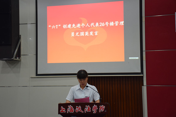 周银娥在致辞中感谢后勤协会各位领导专家的指导支持以及各位一线员工的辛勤付出。她指出,我校通过公寓“六T”达标创建认识到了差距,规范了社区工作的内容和流程,加强了学生公寓的制度建设、文化建设,以评促建、以评促改,取得了良好的效果。但是,随着学生个性化的成长的需求不断提高,对公寓服务管理工作也提出了更高的要求。希望在2017年的创建工作中,要继续以学生为中心,切实做好服务和育人工作;不断凝练特色,完善制度,稳步推进;各部门要通力合作,倾力投入,持之以恒。她强调,公寓“六T”的达标创建工作不是形象工程,要把“六T”的建设标准和创建经验推广到各公寓楼,促进我校公寓服务管理水平整体提升。
