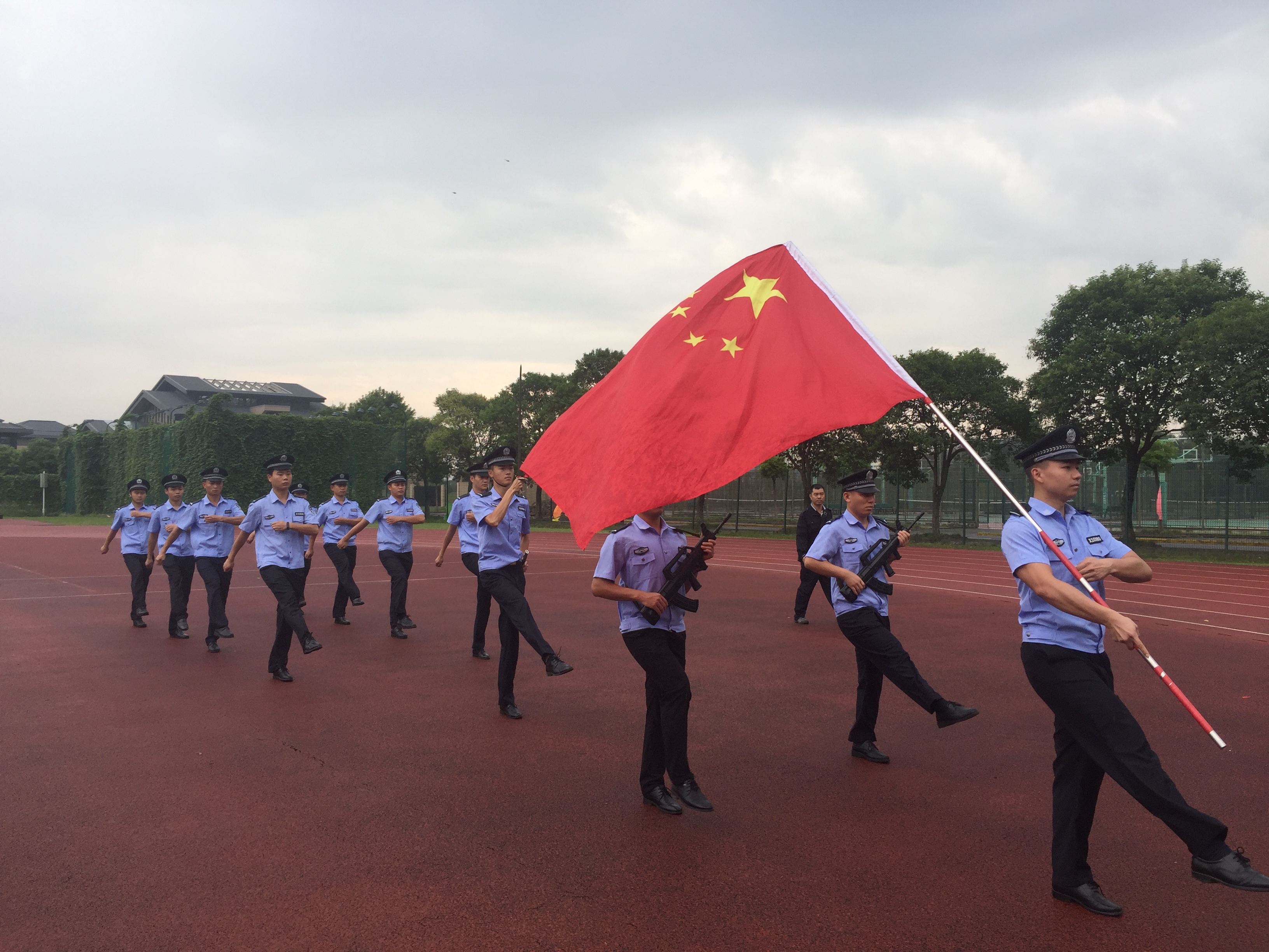 来自警务学院国旗班警训队员组成的护旗方队,迈着铿锵有力的步伐护卫国旗,在雄壮的《义勇军进行曲》中,五星红旗冉冉升起。全体同学脱帽站立,行注目礼。