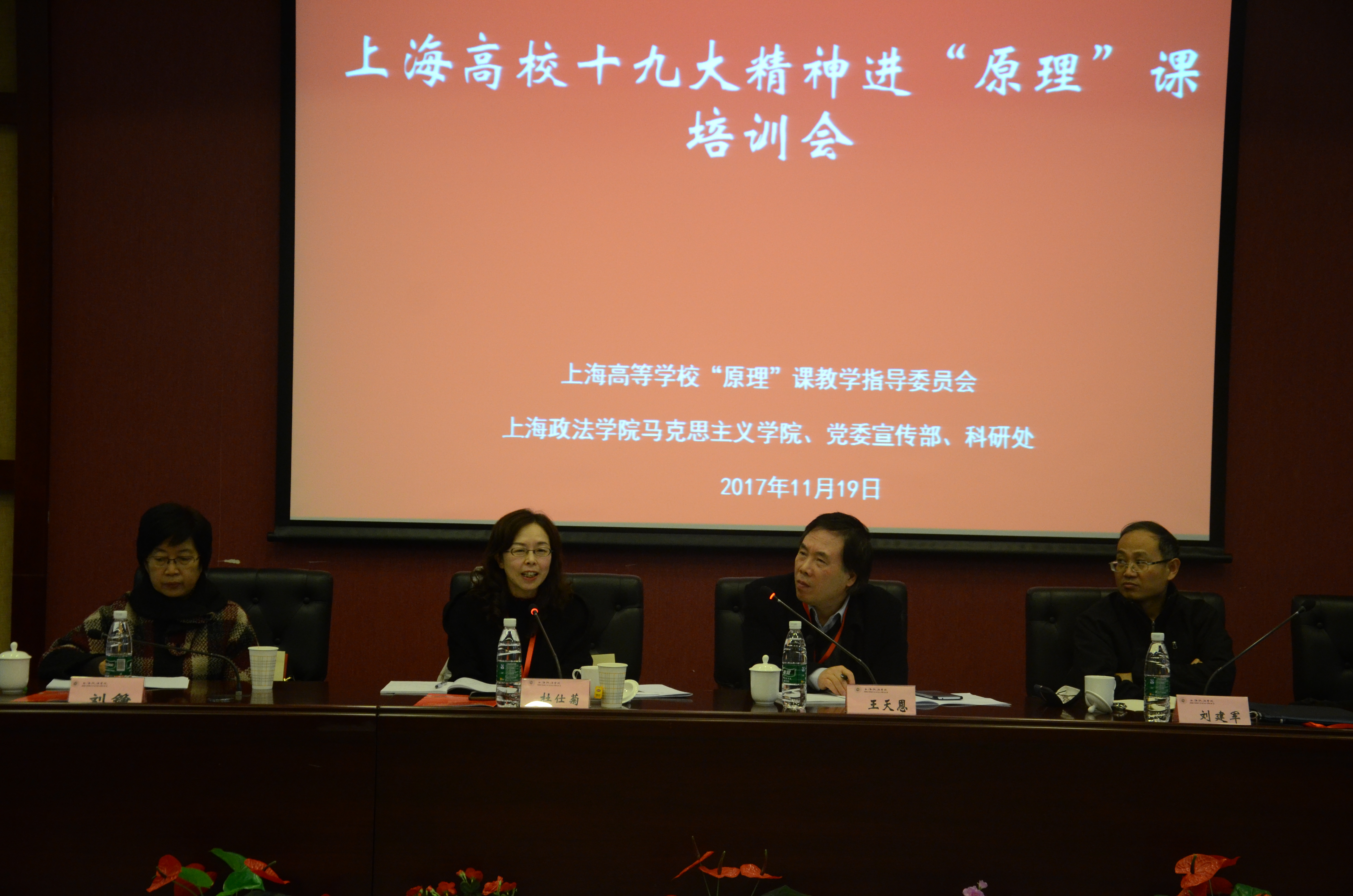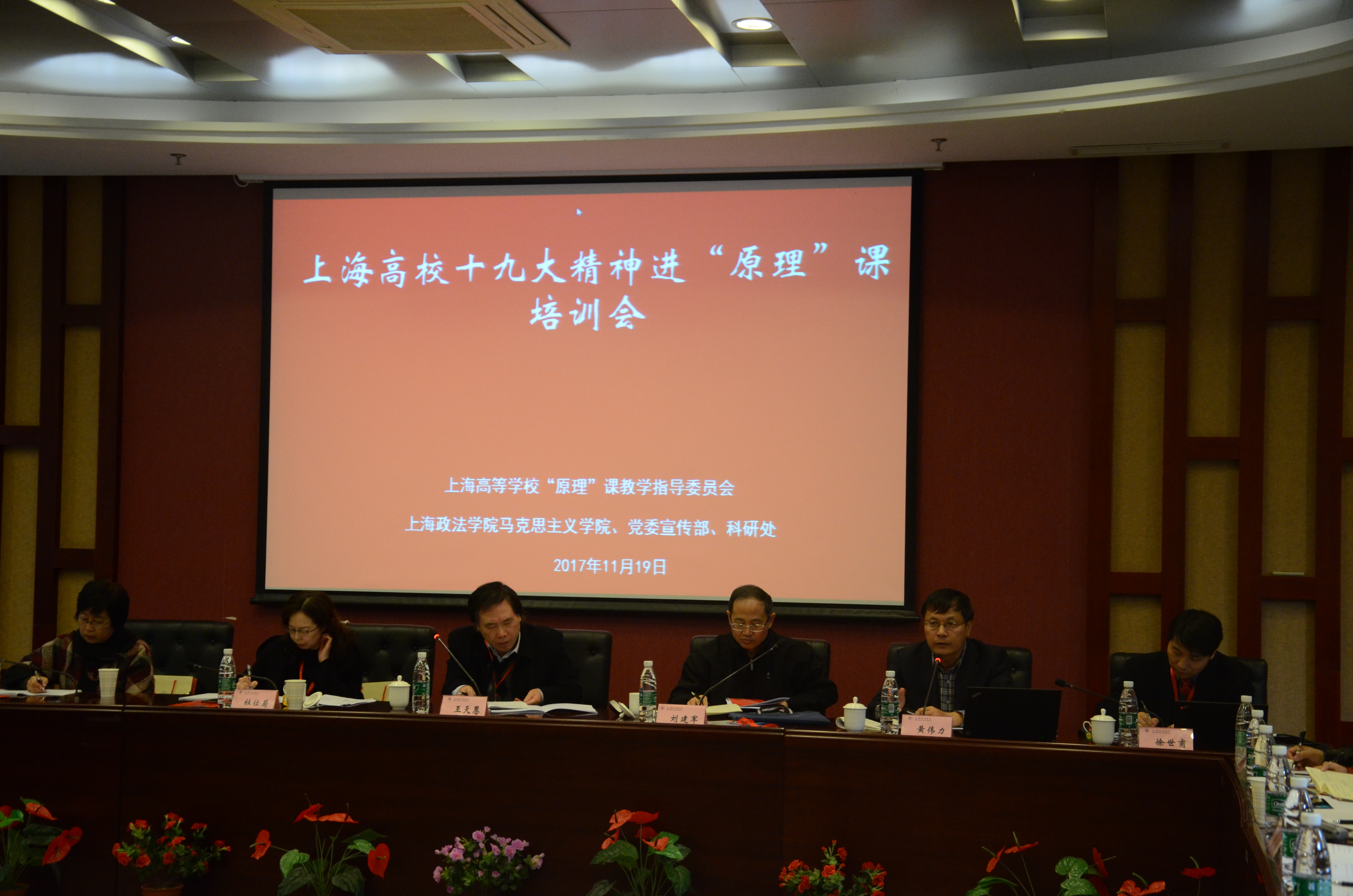 11月19日,由上海高校思想政治理论课《马克思主义基本原理概论》分教指委主办,上海政法学院马克思主义学院、党委宣传部和科研处承办的“上海高校十九大精神进‘原理’课培训会”在上海政法学院隆重召开,来自中国人民大学、复旦大学、上海交通大学、华东师范大学、同济大学、上海财经大学、上海大学、上海师范大学等高校的60余位专家学者出席培训会。会议由上海高校思想政治理论课《马克思主义基本原理概论》分教指委主任委员、上海大学马克思主义学院王天恩教授主持。