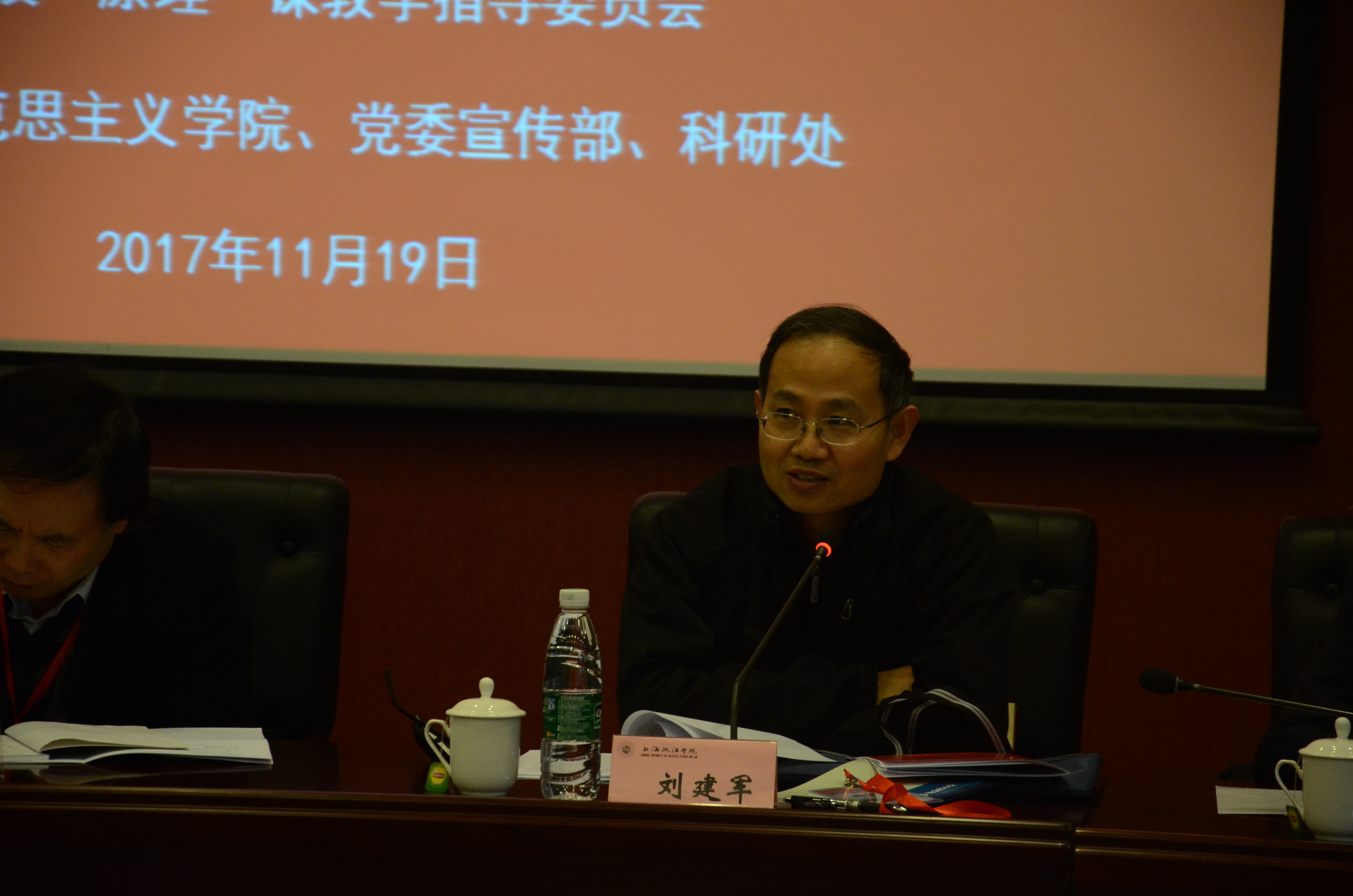 整个培训会分三个阶段,在主题演讲阶段,中央实施马克思主义理论研究和建设工程首席专家、教育部长江学者特聘教授、中国人民大学马克思主义学院刘建军教授首先对“新时代”进行了深入阐述,重点就如何准确理解十九大精神,如何贯彻落实十九大精神“三进”工作等作了精彩演讲。刘建军指出,中国特色社会主义事业进入新时代是基于社会主义发展成就和历史新变革、社会主要矛盾转化、“两个百年”目标交汇期、国内经济形势转化以及社会精神氛围与国民心理产生转变而提出的,具有深刻的理论与现实依据。接着,他就十九大精神如何进教材作了深入讲解,指出思想政治理论课教材的修订已经成为当务之急。而教材修订工作的首要任务是把十九大精神有机融入教材中去,而不是对某一个名词或概念的修修补补,要使教材既能体现十九大报告的思想内容,更要体现十九大后国内呈现的精神新面貌。最后,他还对十九大精神如何进课堂等提出了具有启发性的观点。