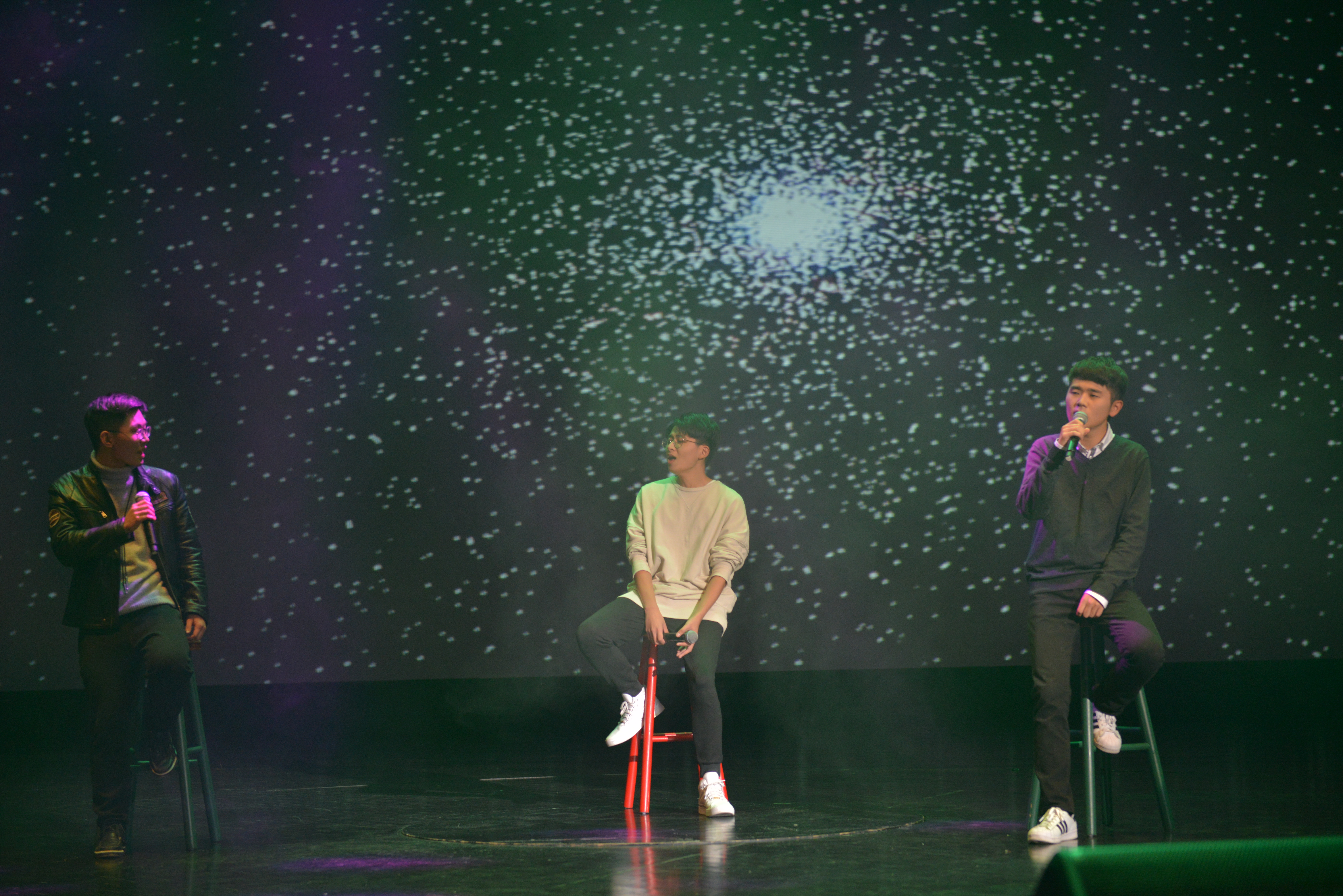 随后,四位冠军导师给在场观众带来了一首歌曲串烧《天下无双-胡桃夹子-白天不懂夜的黑-不为谁而作的歌-伤心的人别听慢歌》,歌声有轻有重,有快有缓,有激烈有抒情,一瞬间,将原本沉寂的学生礼堂的氛围点燃。