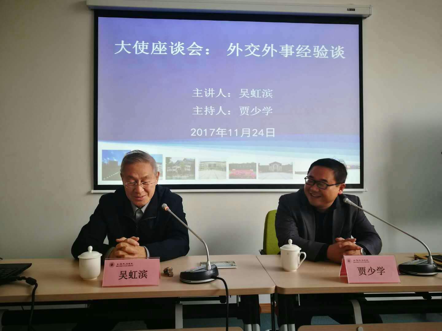 11月28日,三位大使与培训基地、国际交流处、国际交流学院、留学生办公室等多个涉外部门工作人员围绕外事工作纪律、外交管理制度、外事人员培训等多个议题进行座谈。当天下午,三位大使又来到国际事务与公共管理学院,与30余名专业老师进行了学术交流。